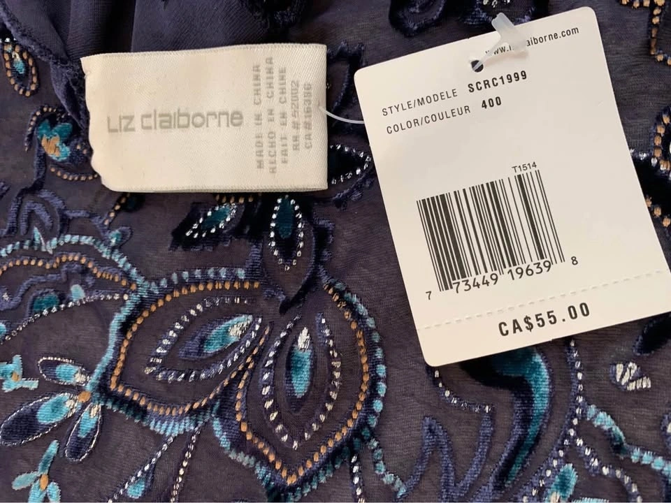 New Liz Claiborne Shawl/wrap, still has tags on, perfect for gifting. Made of silk and rayon. Measures 70" wide. Available for pickup in Mississauga (Colonial Dr & Burnhamthorpe) or Toronto (Bayview/Eglinton) on Sundays or Mondays.