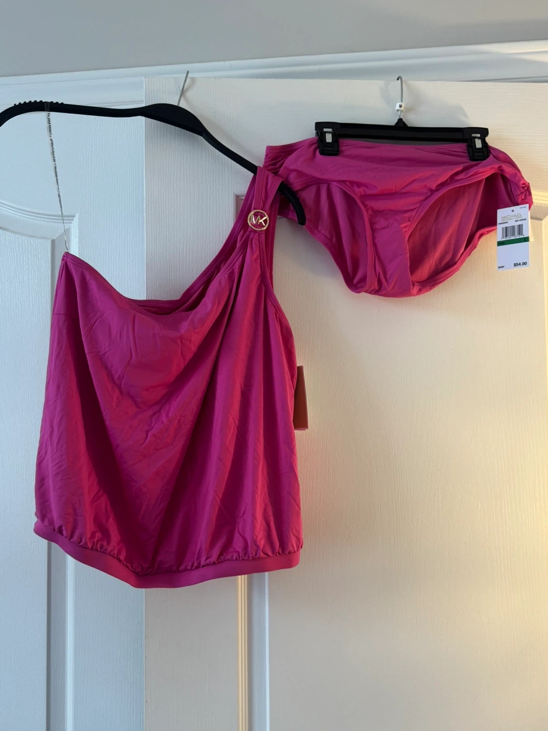 Selling a brand new Michael Kors swimsuit! It's a vibrant pink colour and still has the tags attached. The original price tag shows $54.00. Perfect for the summer!
