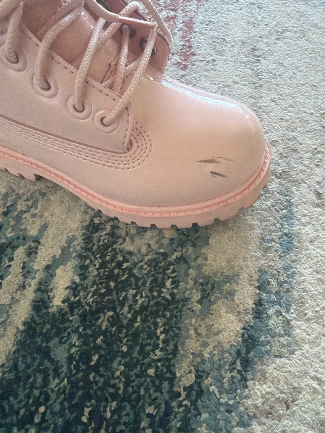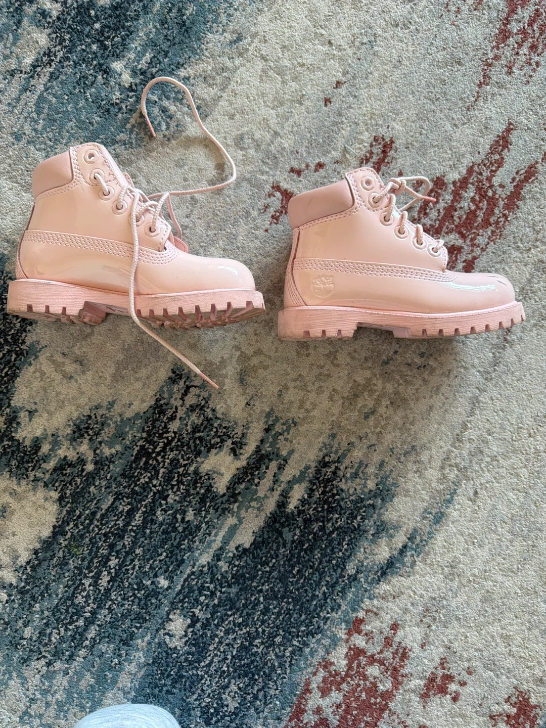 These adorable Timberland boots are a lovely light pink patent leather. They're lace-up style with a side zipper for easy on and off. Some minor scuffs are visible on the toes. Perfect for keeping little feet warm and stylish! 50 firm