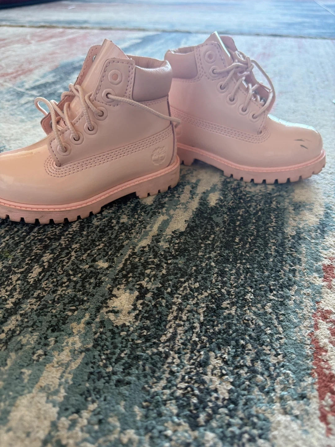 These adorable Timberland boots are a lovely light pink patent leather. They're lace-up style with a side zipper for easy on and off. Some minor scuffs are visible on the toes. Perfect for keeping little feet warm and stylish! 50 firm