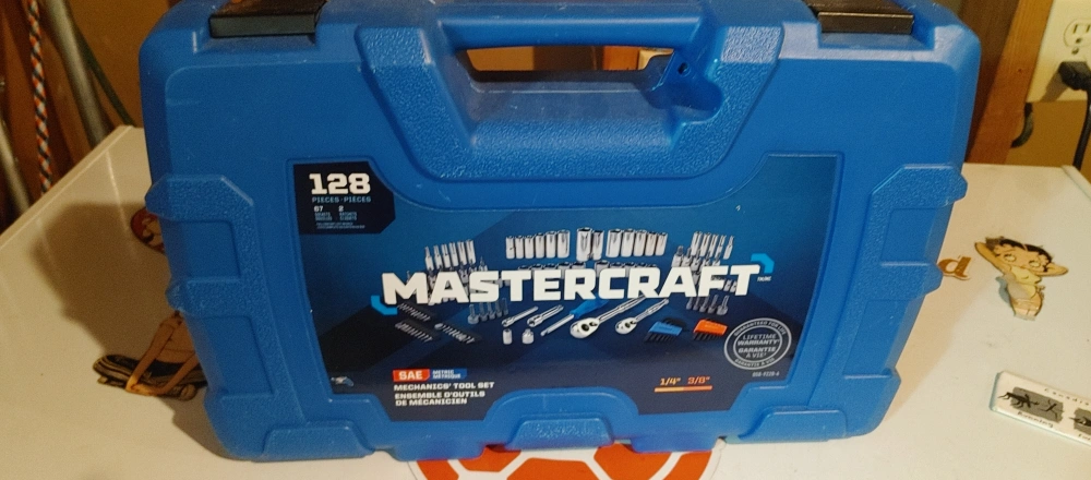 Selling a Mastercraft 128-piece mechanics tool set. It includes SAE and Metric sizes, perfect for any automotive or mechanical work. Comes in a sturdy blue case to keep everything organized. Regularly 180-250.00 brand new