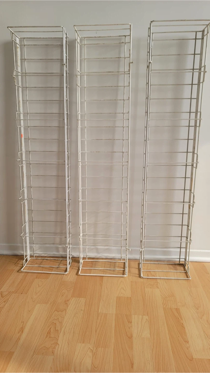 Set of three white wire display racks. Each unit features multiple shelves for organizing and showcasing items. Sturdy metal construction.
