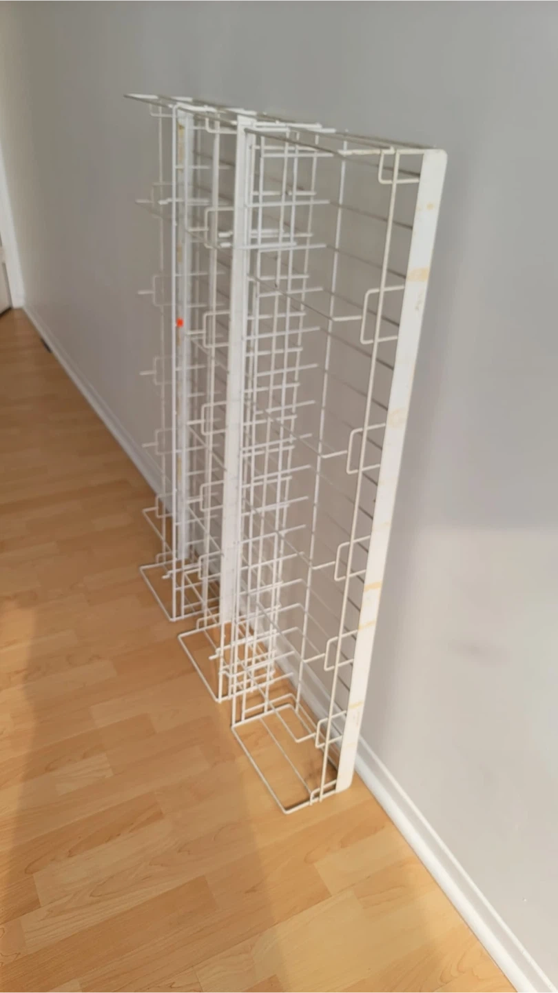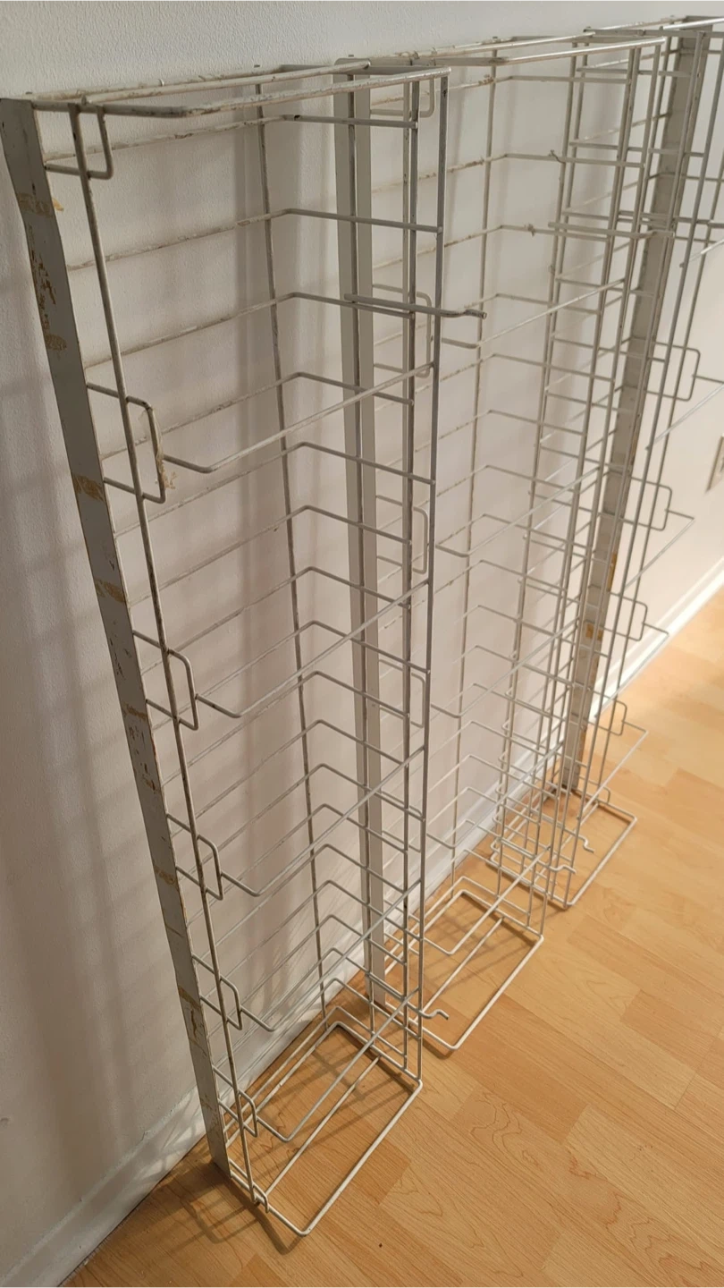 Set of three white wire display racks. Each unit features multiple shelves for organizing and showcasing items. Sturdy metal construction.