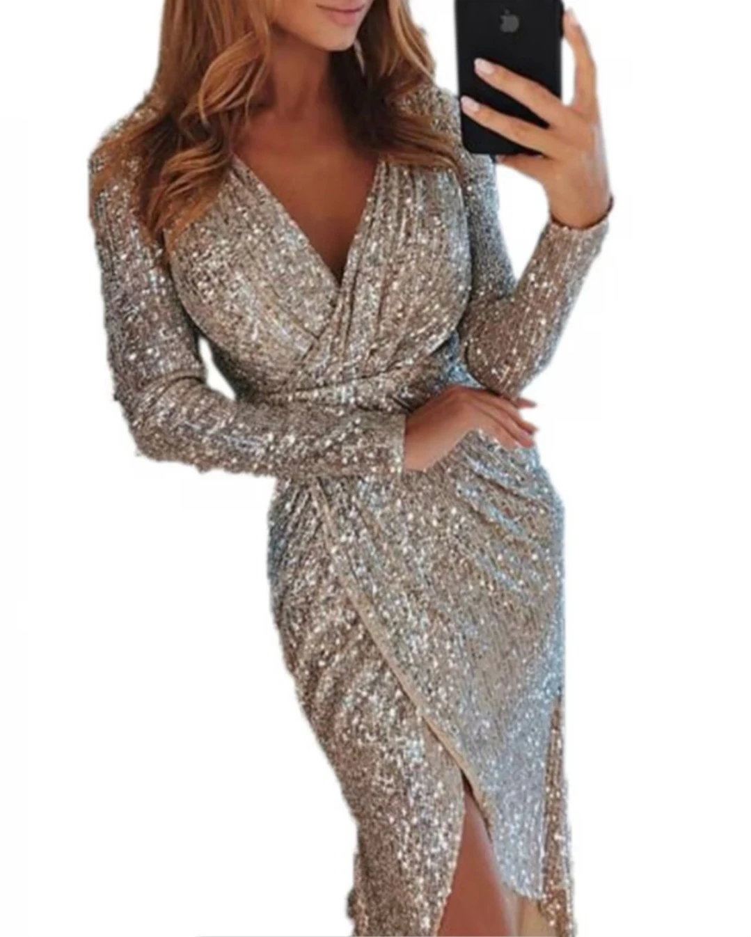 This dress is covered in shimmering silver sequins. It features a flattering wrap silhouette with long sleeves and a slit skirt. It's perfect for a night out or special occasion!