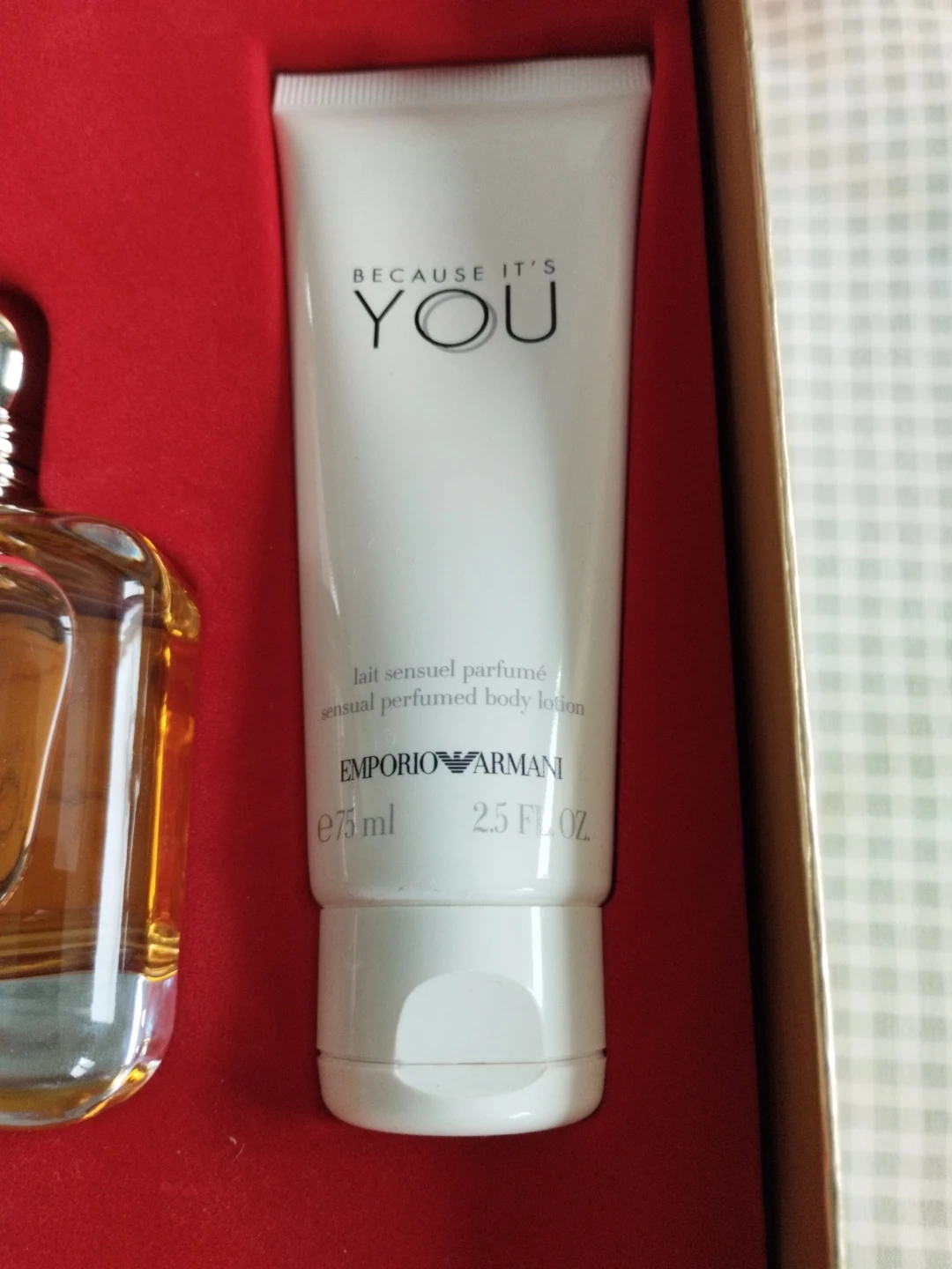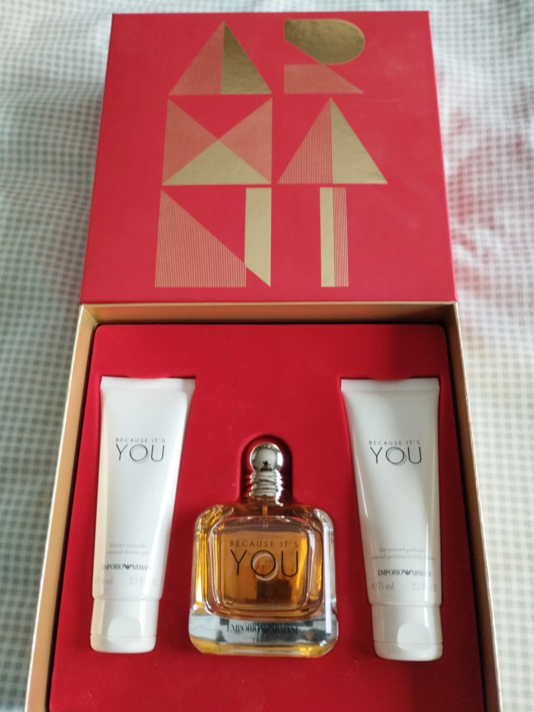 This gift set includes an Emporio Armani "Because It's You" Eau de Parfum 100ml and two 75ml bottles of sensual shower gel and perfumed body lotion. It's a lovely fragrance for everyday wear.