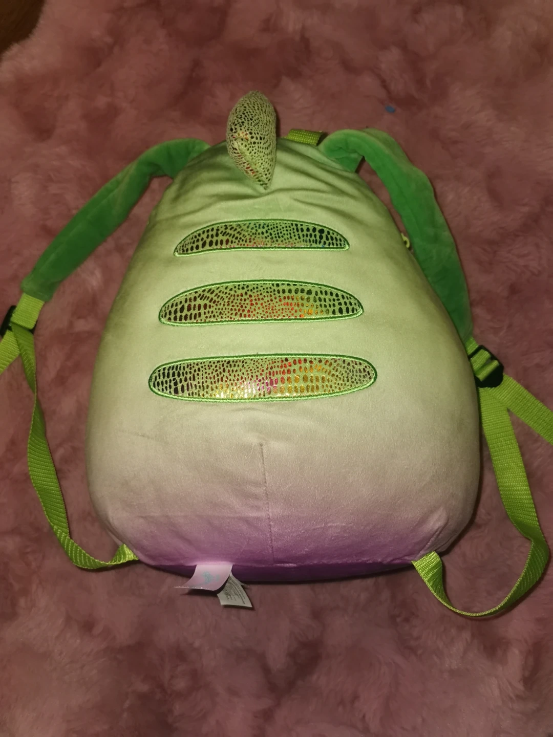 Super cute green dinosaur Squishmallow backpack! It's soft and plush, perfect for carrying little treasures. The adjustable straps make it comfy for kids. Great for daycare or a fun day out!