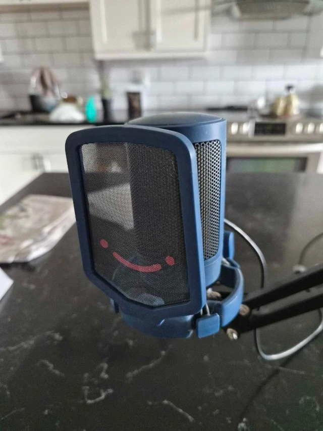 Blue Fifine USB microphone with RGB lighting and mute button, gain control, and pop filter.