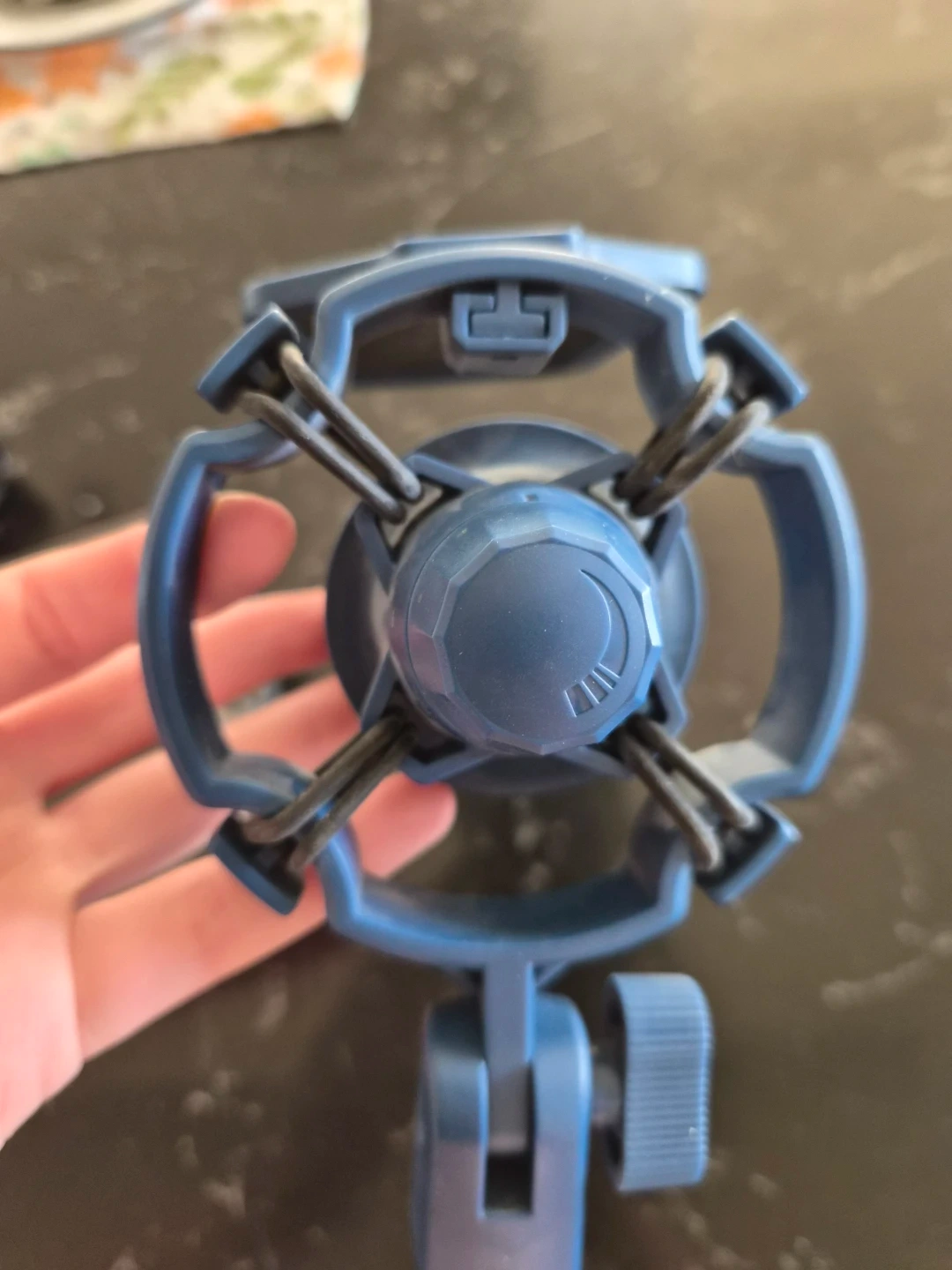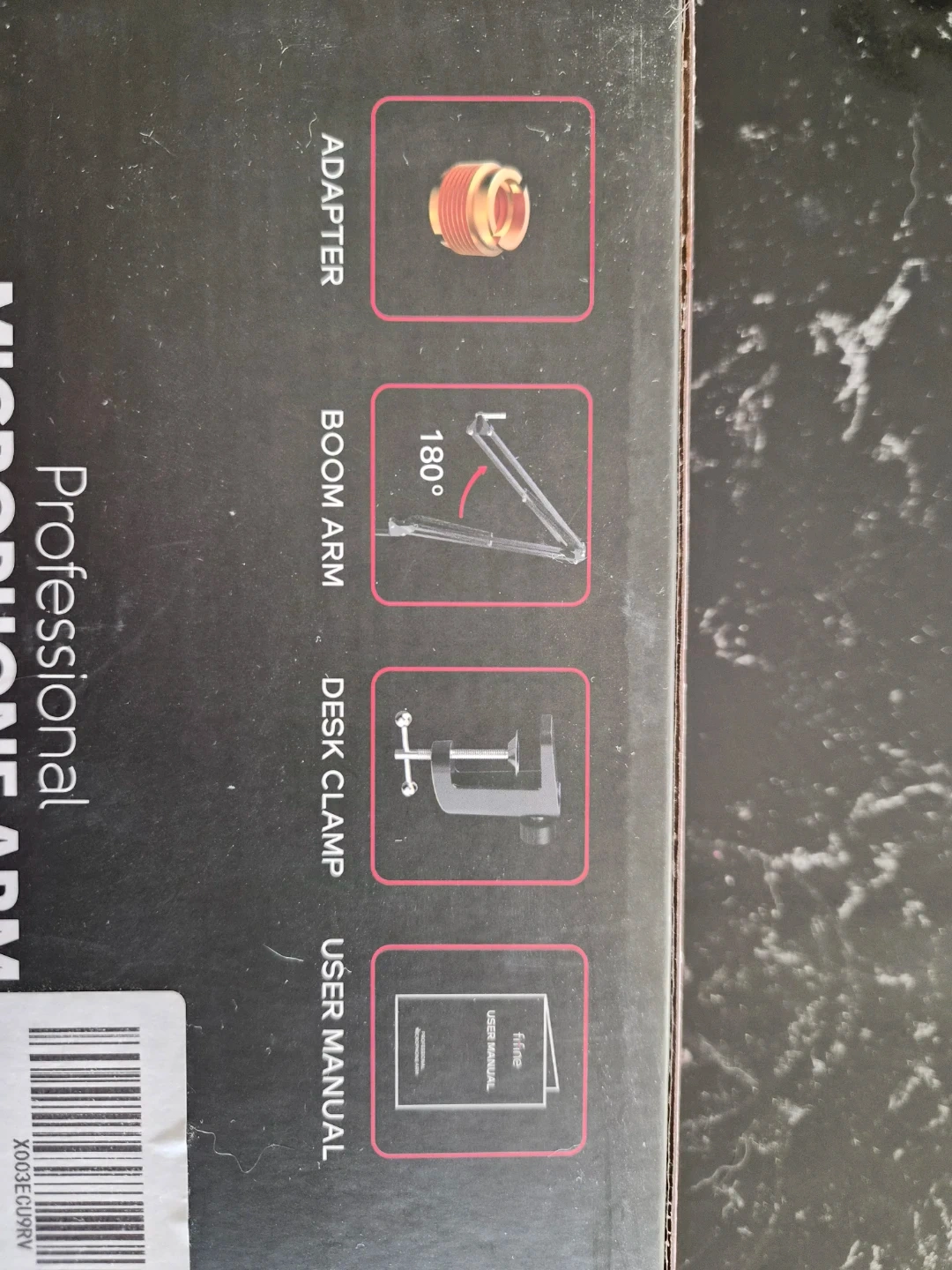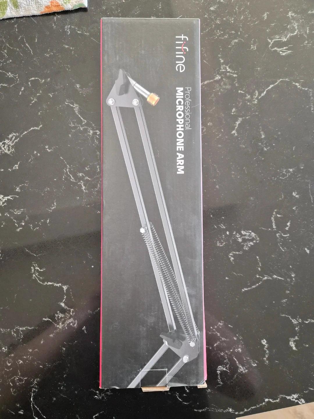 Comes with tripod stand and basically new fifine professional microphone arm with desk clamp up to 2.1" in the box.