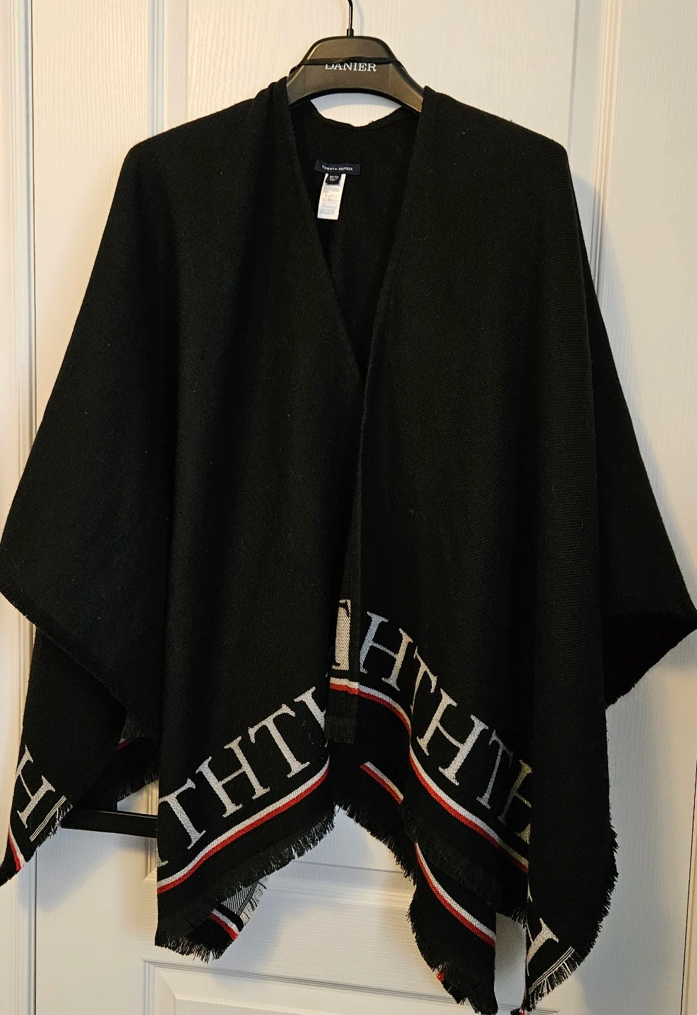 Black poncho cape by Tommy Hilfiger. It's adorned with the brand's logo along the hem. A stylish layering piece for cooler weather!