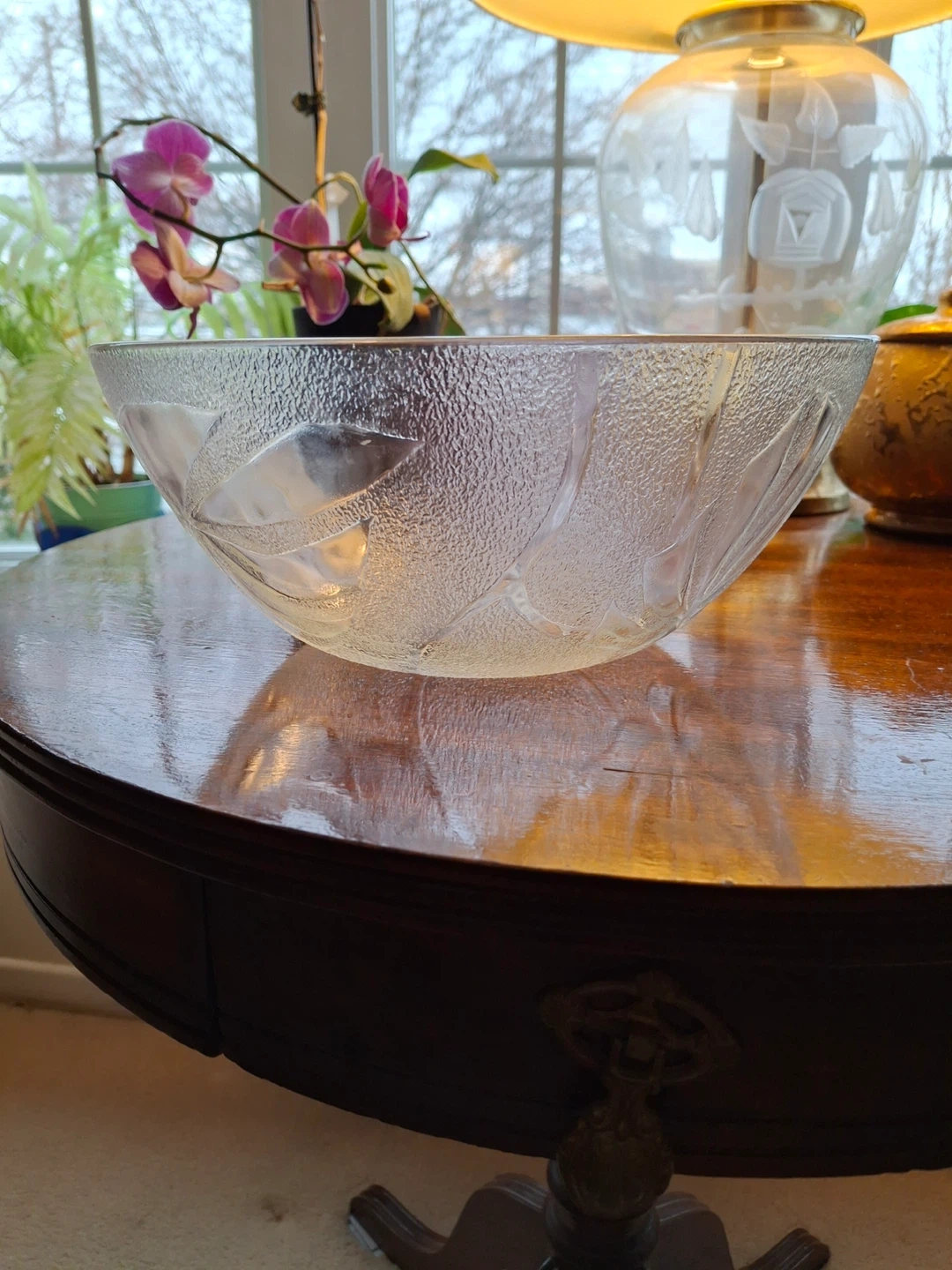 Large clear glass bowl with flower design. Textured on the outside. 10” across and 4” high. Excellent condition.