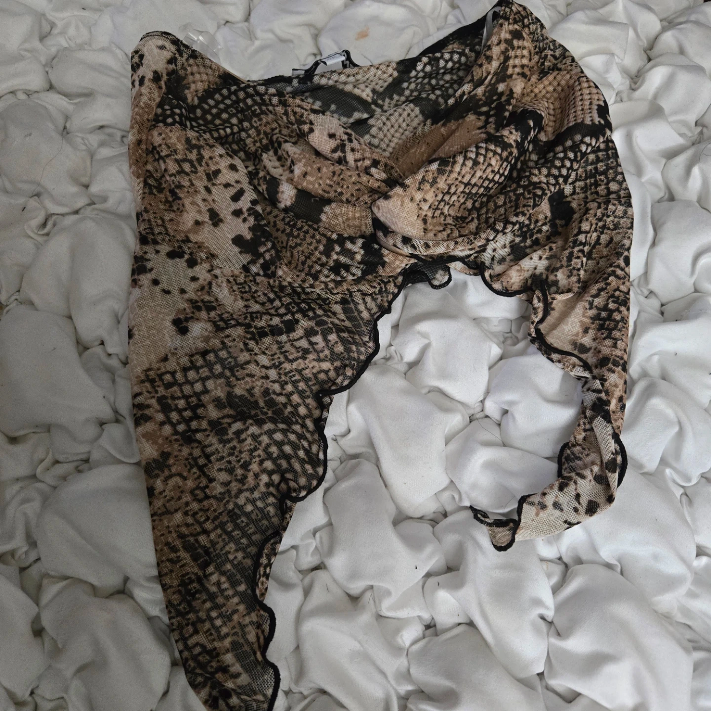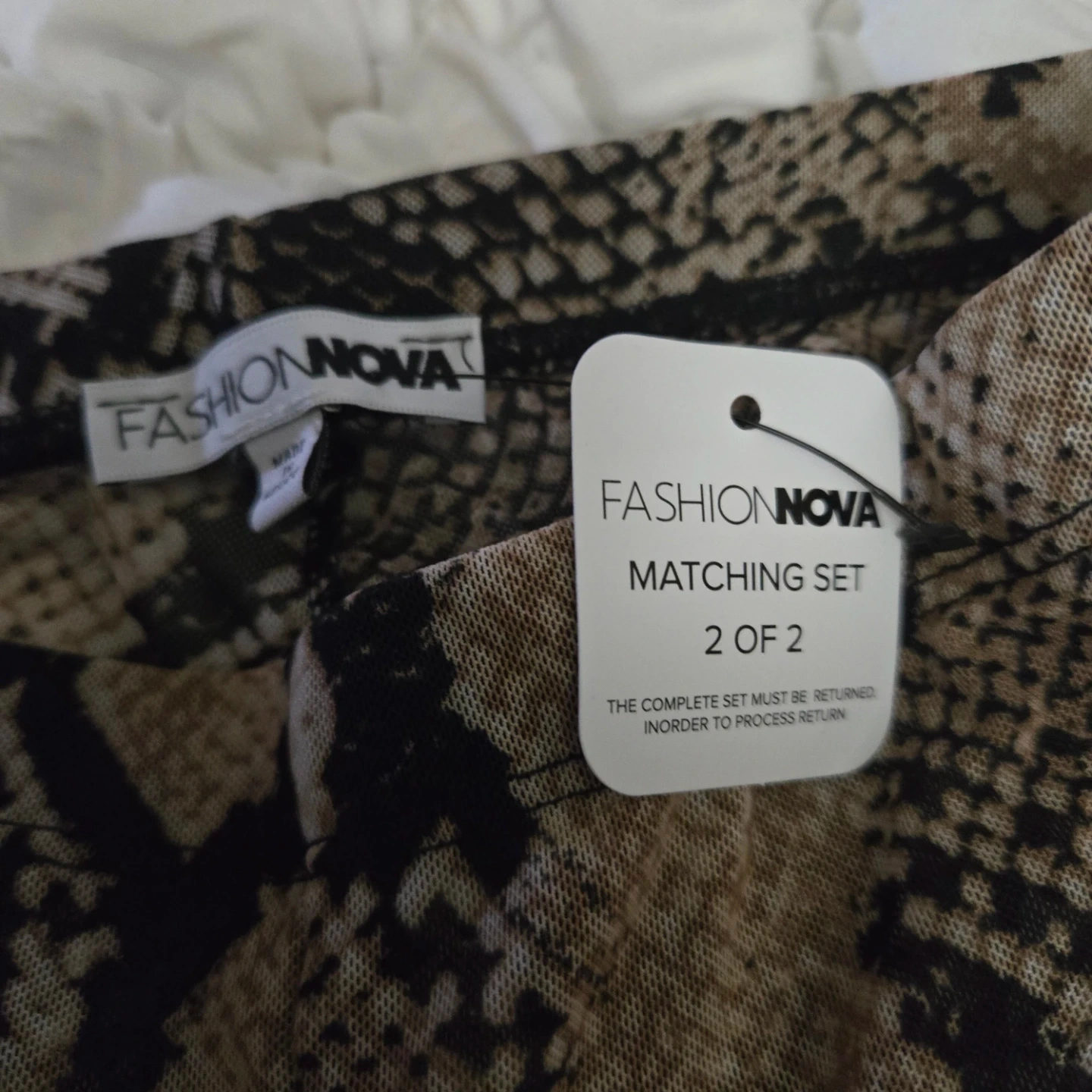 This is a Fashion Nova snake print mesh maxi set. It includes a long-sleeve top and a maxi skirt. The material is sheer mesh with a ruffle trim.