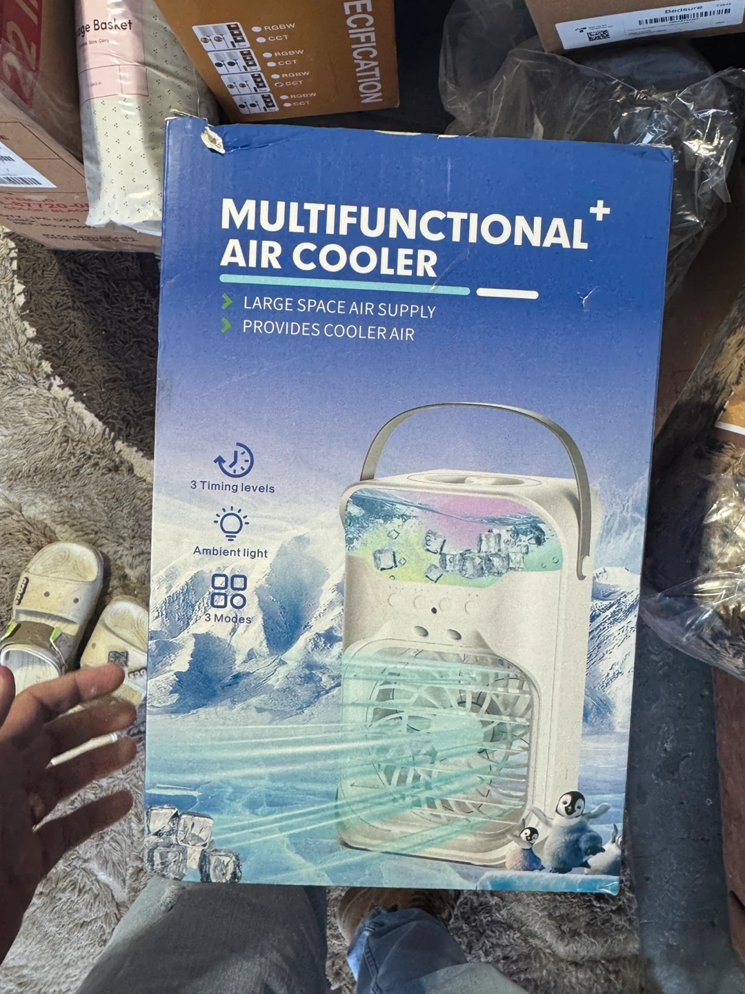 This is a multifunctional air cooler. It's designed for large space air supply and provides cooler air. Features include 3 timing levels and ambient light with 3 modes.