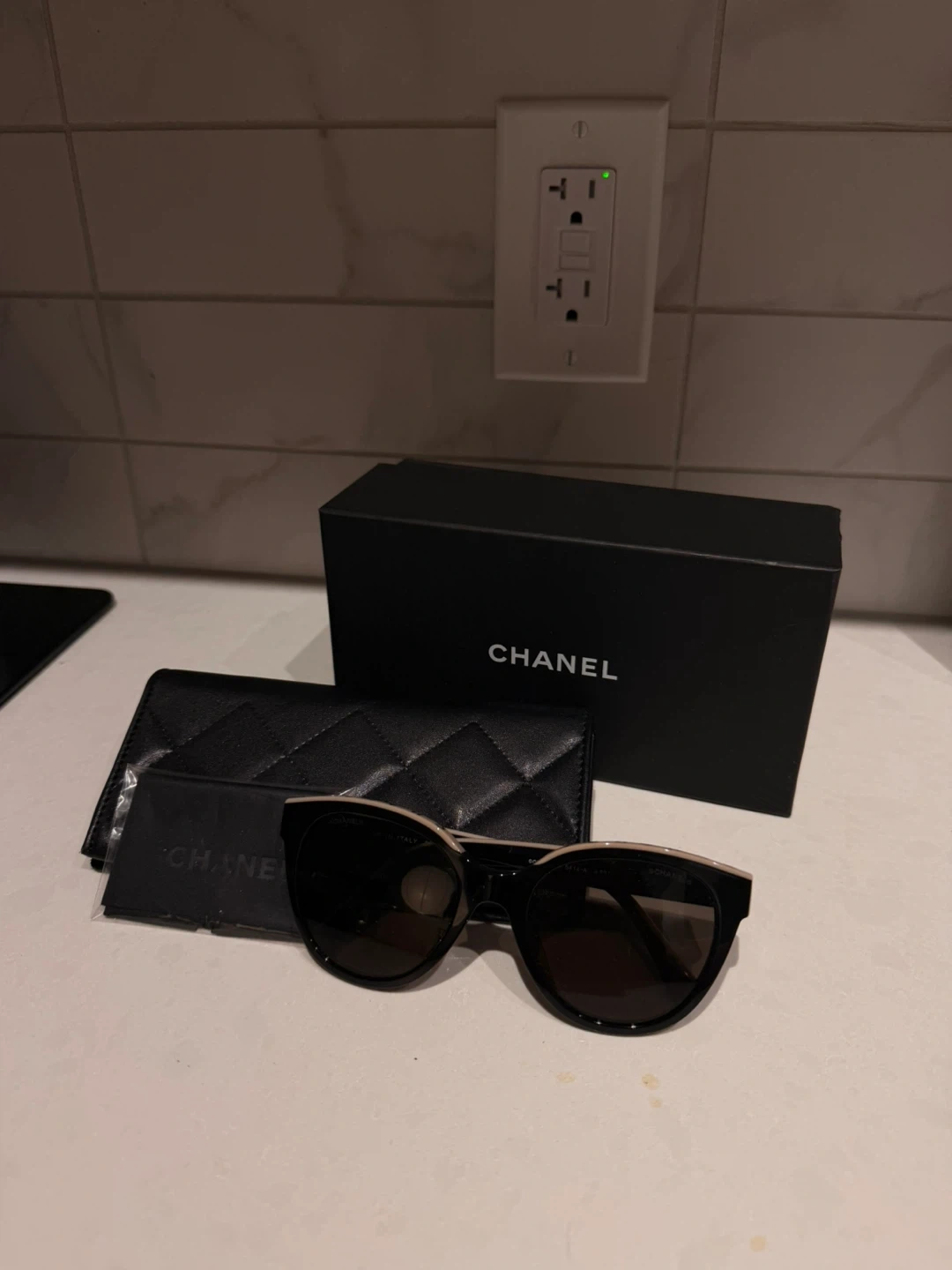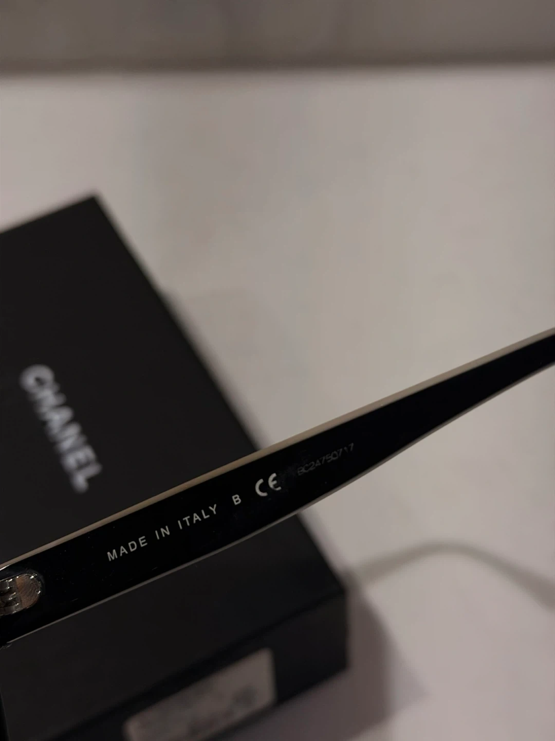 Chanel acetate woman sunglasses in black and beige. Made in Italy. Includes original box and case. Serial number on the side