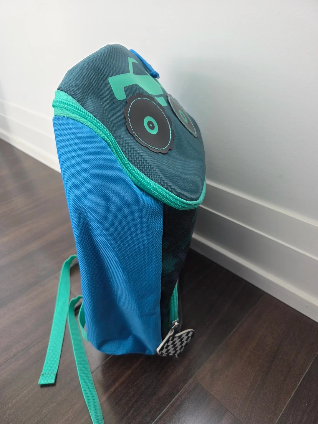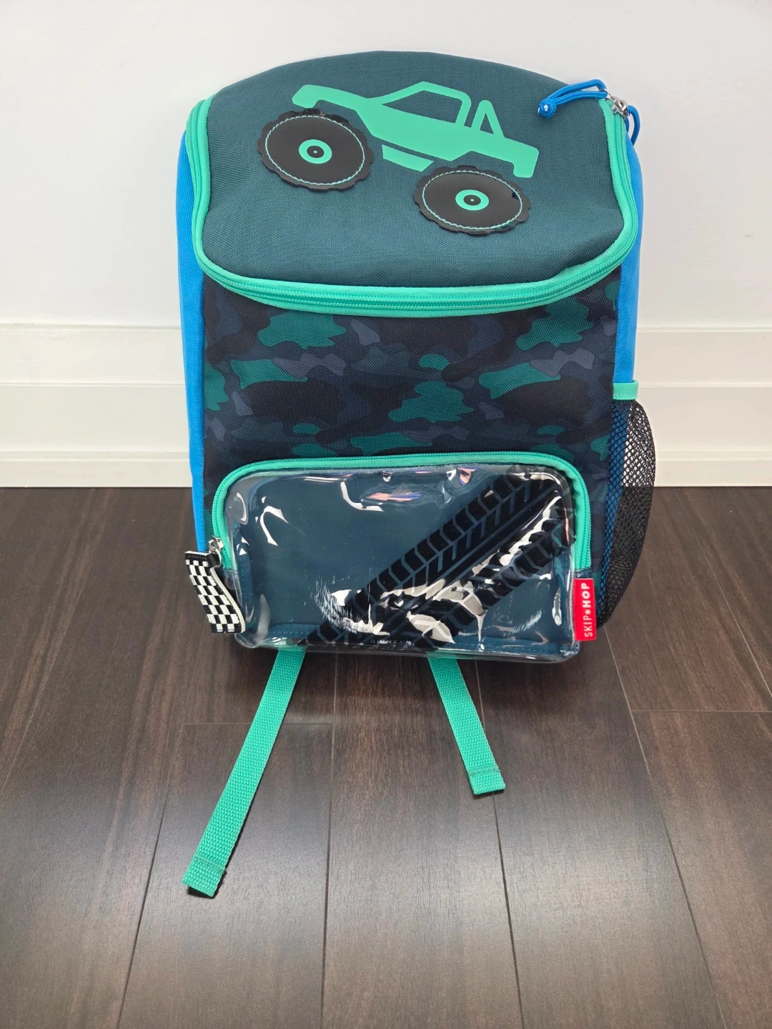 This Skip Hop backpack features a fun monster truck design. It has adjustable padded shoulder straps and a roomy main compartment. The front pocket is clear with a tire tread design inside.