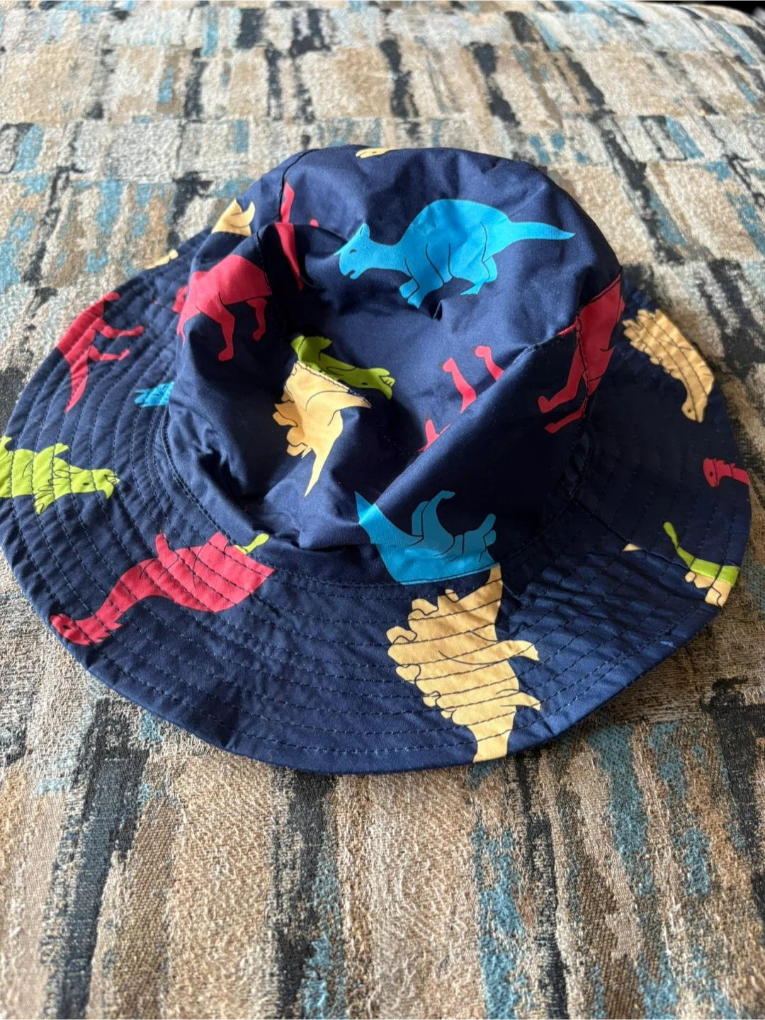 Navy blue bucket hat for kids featuring a colourful dinosaur print. It has a chin strap with an adjustable toggle for a secure fit. Perfect for sunny days outdoors!