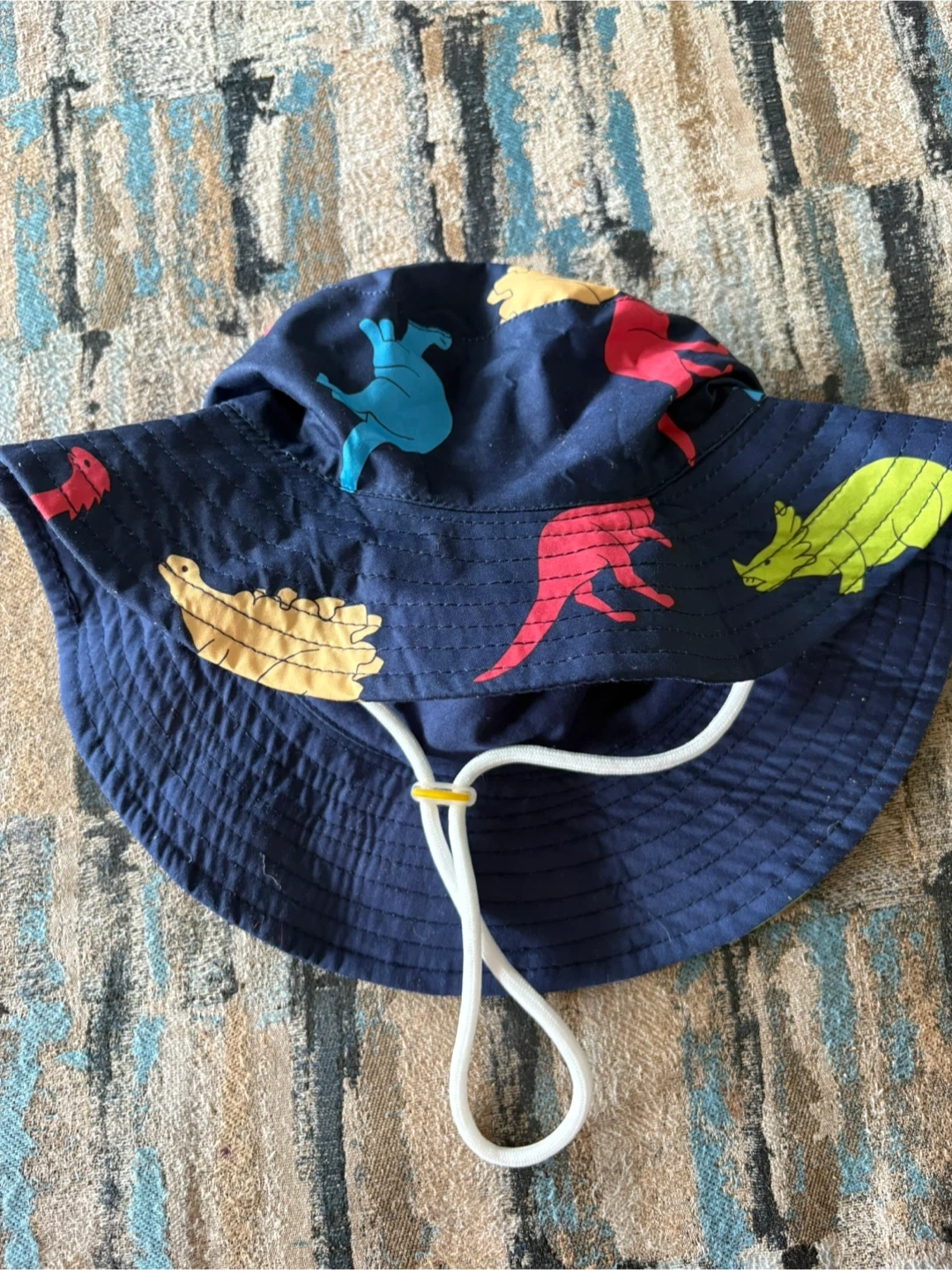 Navy blue bucket hat for kids featuring a colourful dinosaur print. It has a chin strap with an adjustable toggle for a secure fit. Perfect for sunny days outdoors!