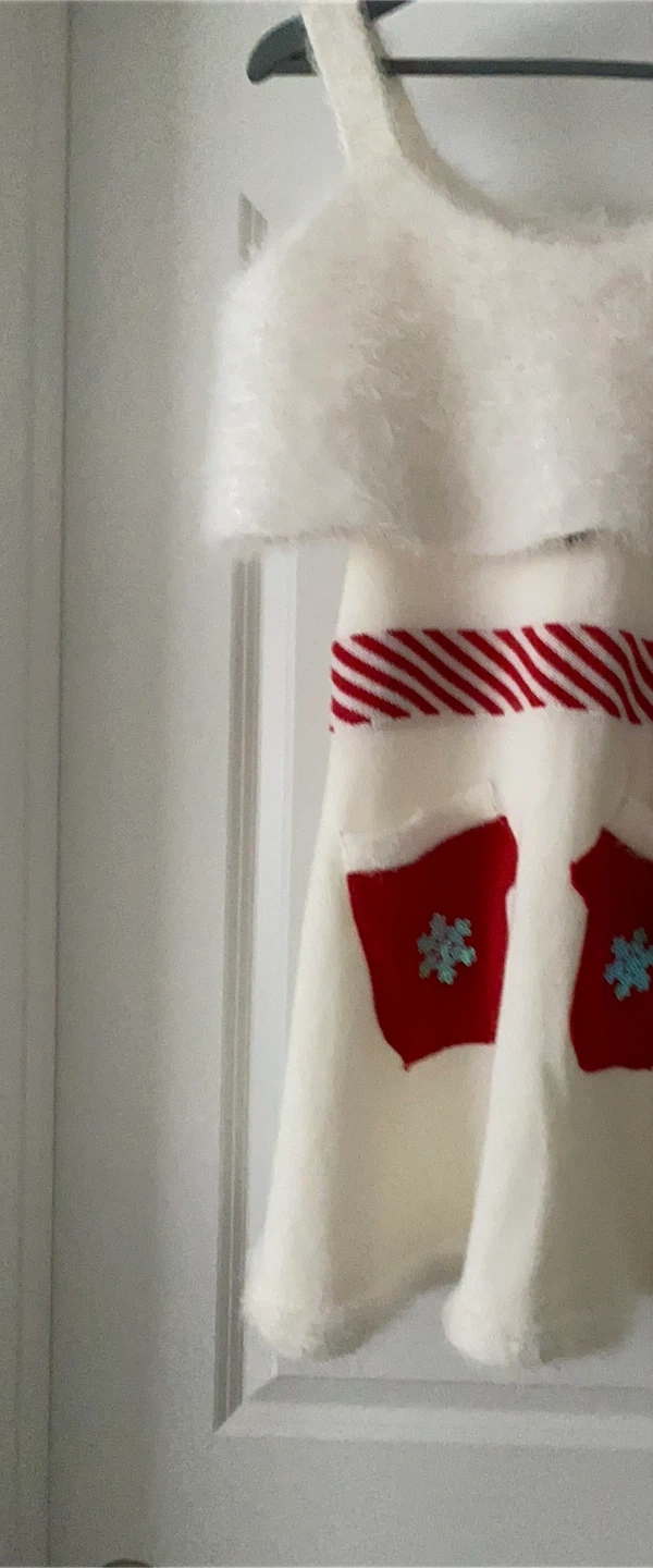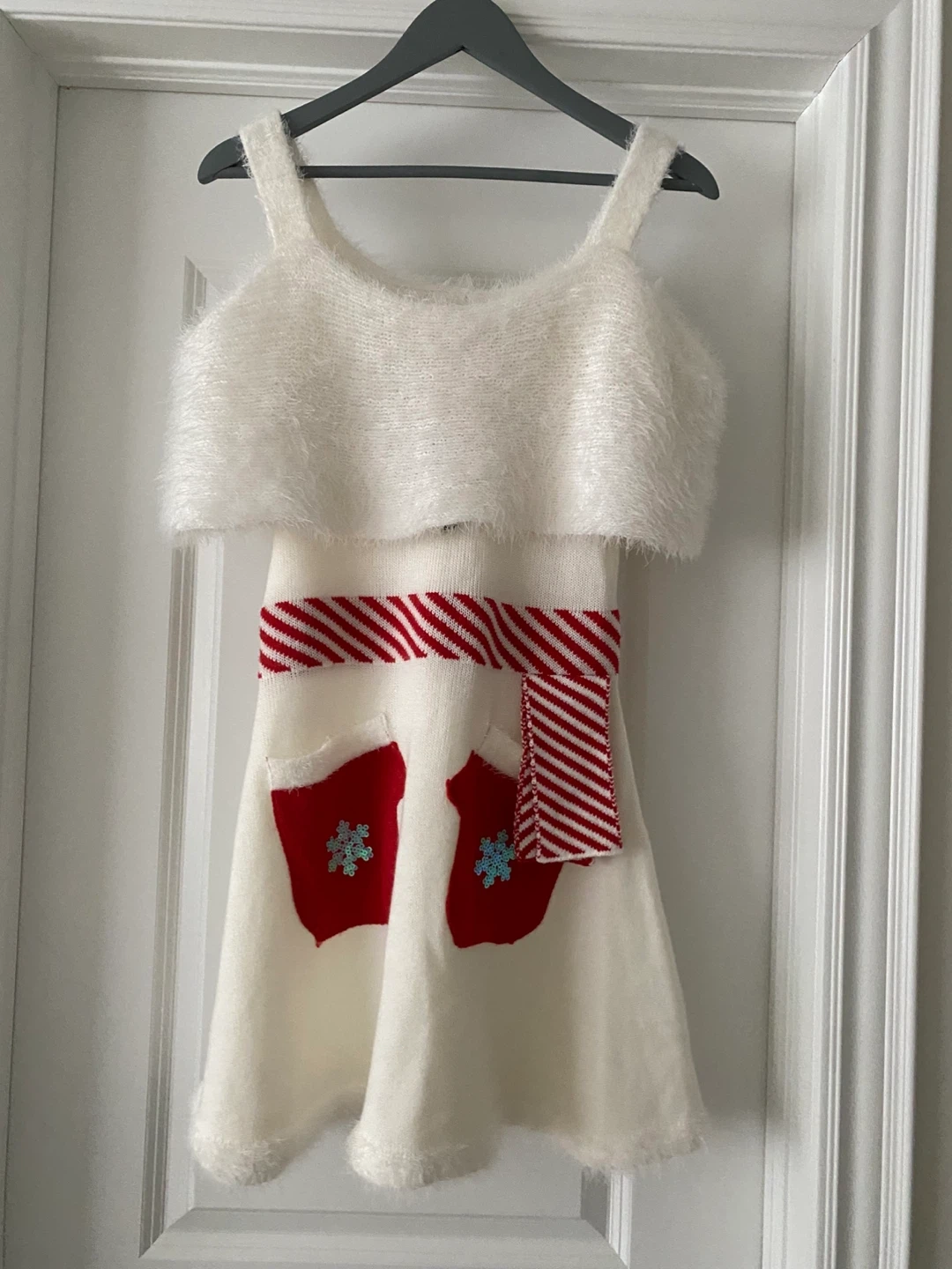 A cute STREETWEAR SOCIETY Christmas snowman dress! It's white with red accents and a red and white striped belt. It has a fuzzy texture and is a size 6