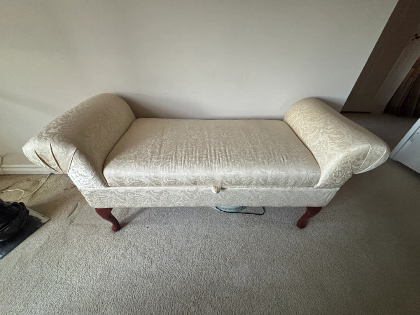 Cream damask upholstered bench with wooden legs. It features hidden storage inside. Perfect for entryways or at the foot of a bed!