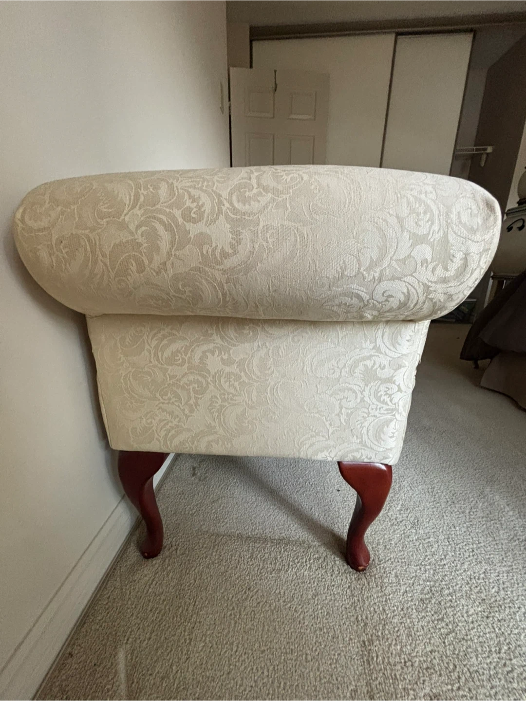 Cream damask upholstered bench with wooden legs. It features hidden storage inside. Perfect for entryways or at the foot of a bed!