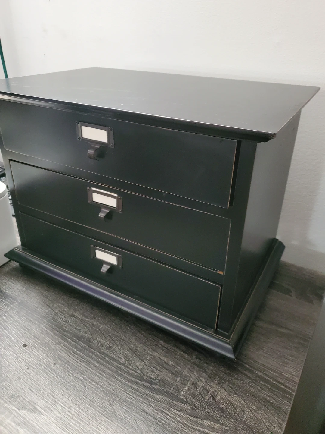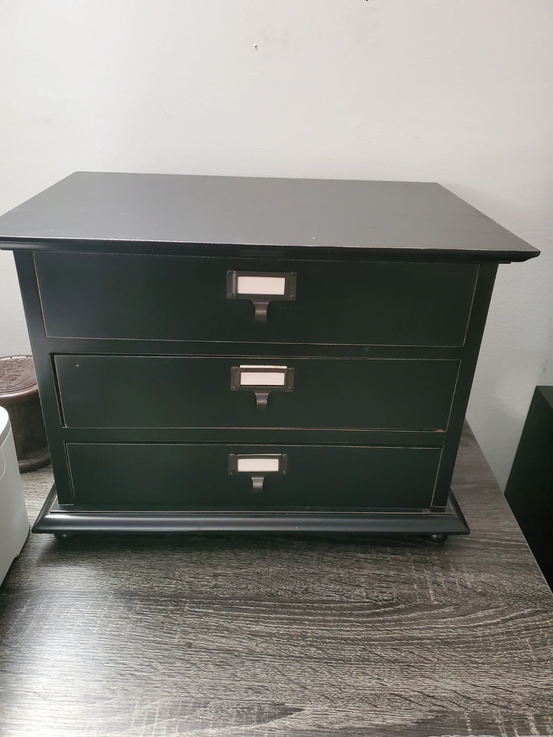 This black organizer features three drawers with label holders. It's perfect for storing small items like craft supplies or desk essentials. The drawers glide smoothly, offering convenient access to your belongings.