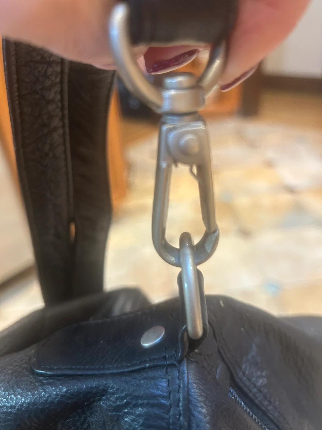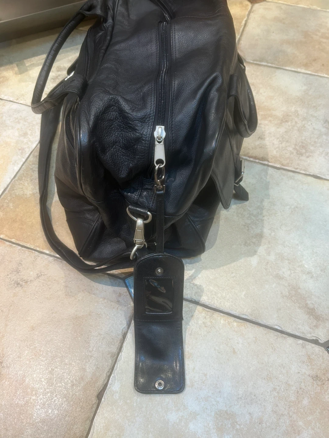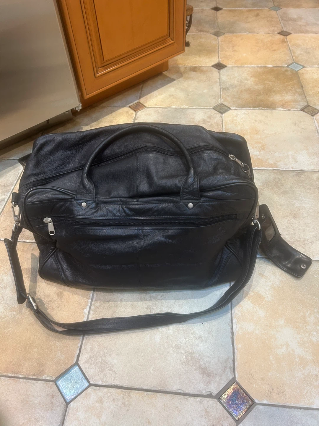 I'm selling a black leather travel bag. It has a shoulder strap and a unique map-print lining. It's in good condition and ready for your next adventure! Sturdy hardware and leather.