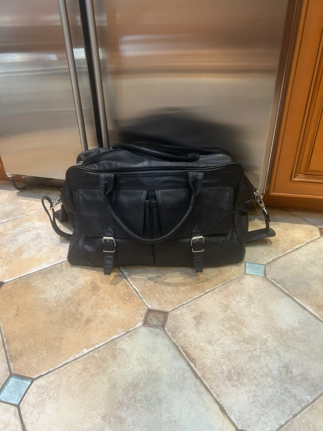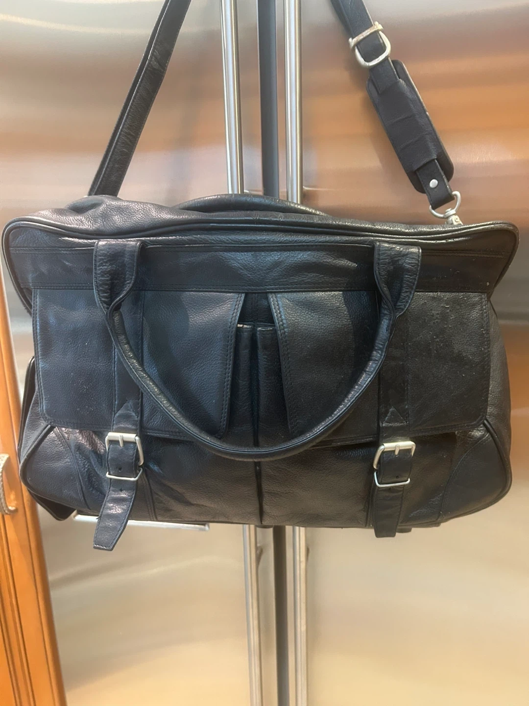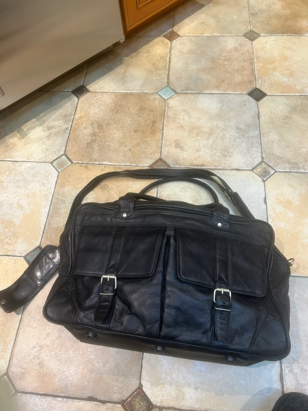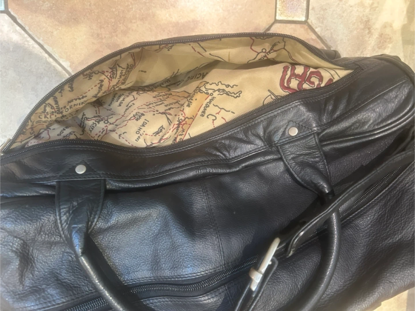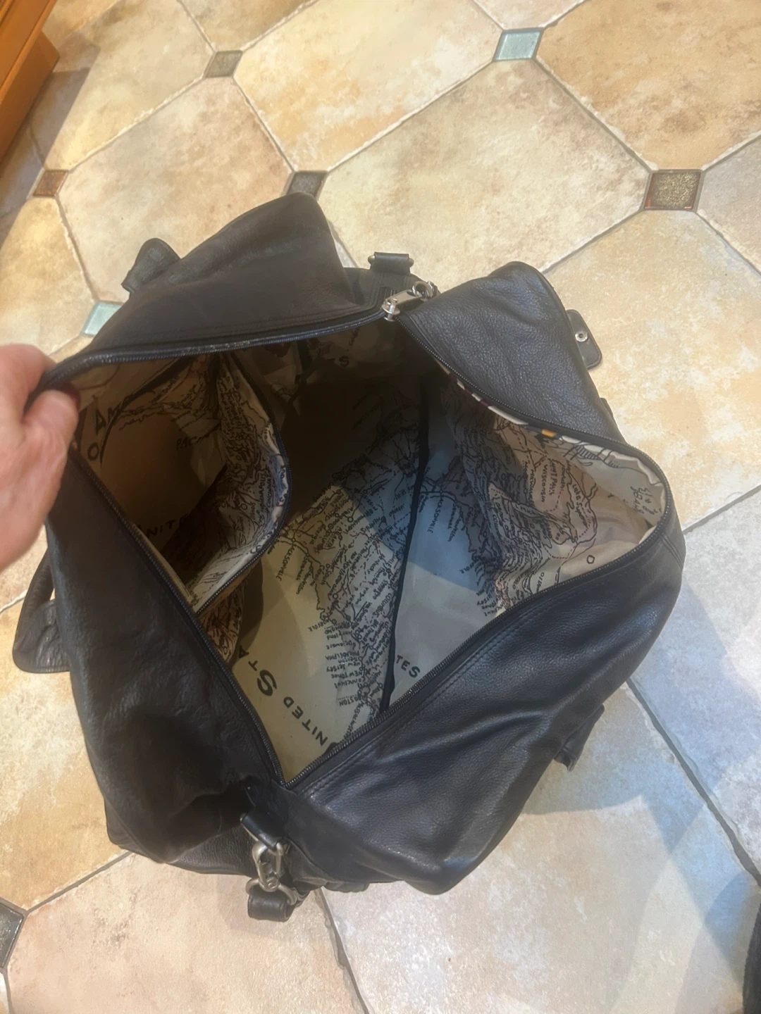I'm selling a black leather travel bag. It has a shoulder strap and a unique map-print lining. It's in good condition and ready for your next adventure! Sturdy hardware and leather.
