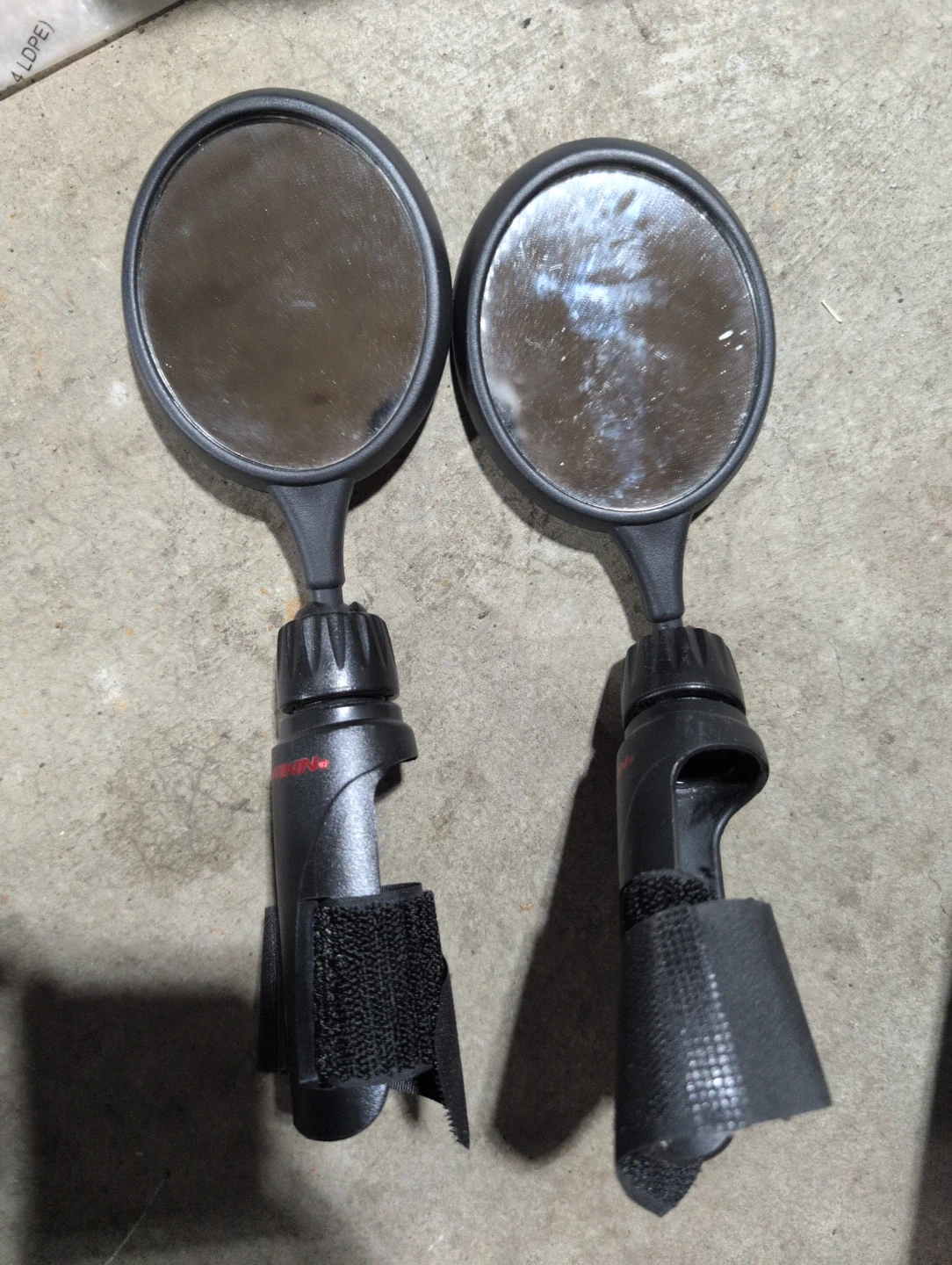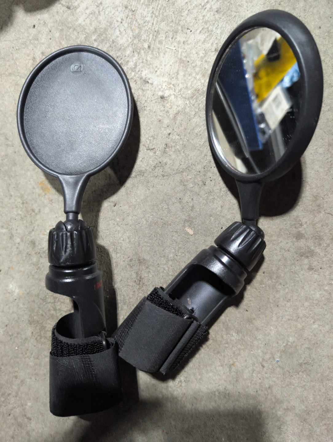These are a pair of black bicycle handlebar mirrors with adjustable straps for attachment. They're designed to give you a clear view of what's behind you while cycling. The mirrors are round with a black plastic casing and stem.
