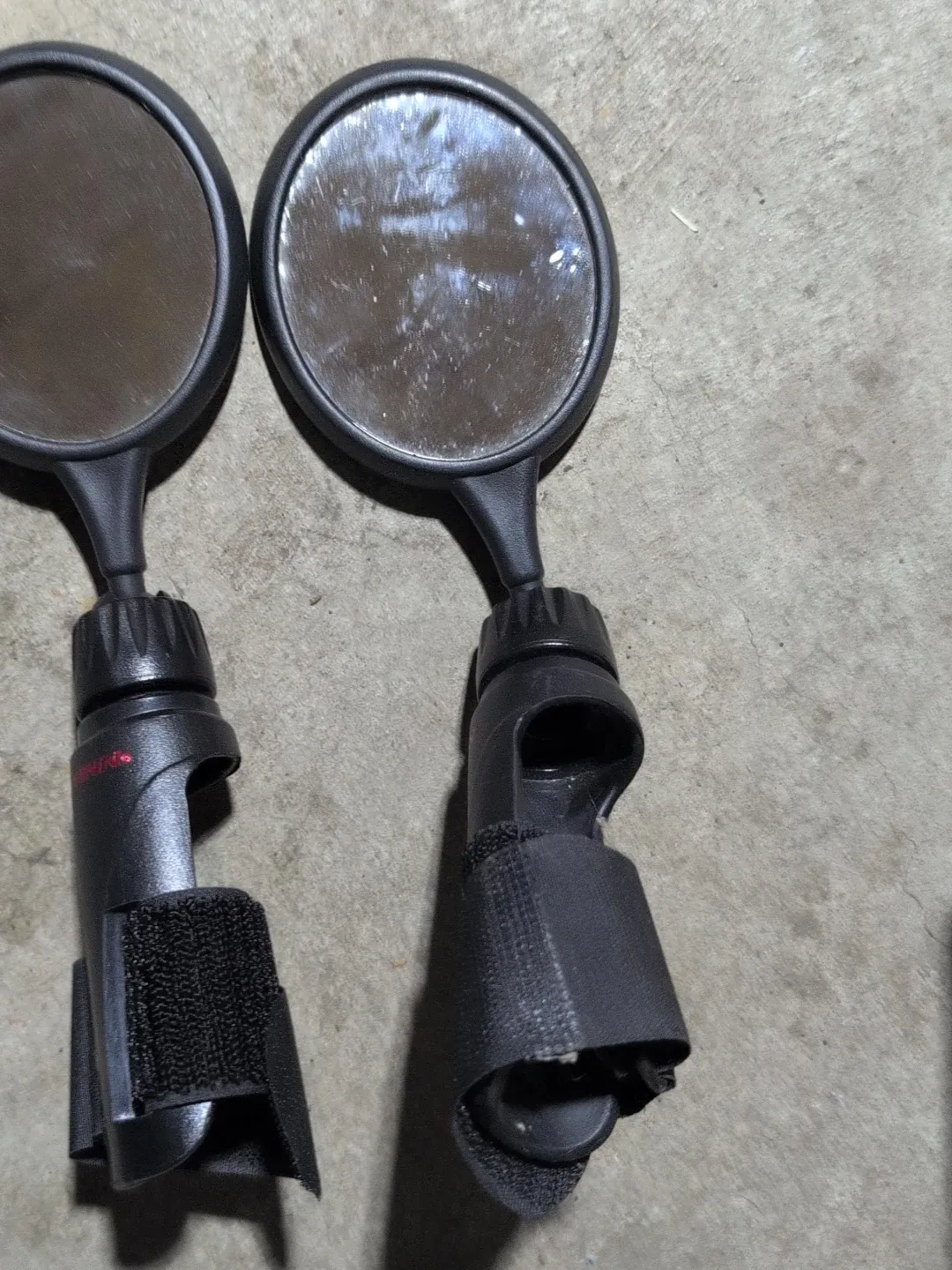 These are a pair of black bicycle handlebar mirrors with adjustable straps for attachment. They're designed to give you a clear view of what's behind you while cycling. The mirrors are round with a black plastic casing and stem.