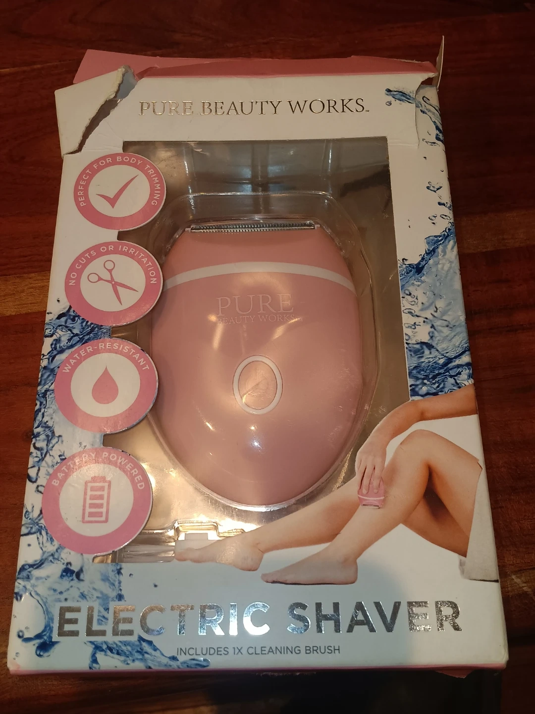 This pink electric shaver from Pure Beauty Works is battery powered and water-resistant. It includes a cleaning brush for maintenance. Perfect for body trimming without cuts or irritation!