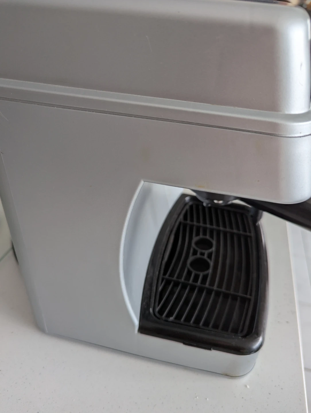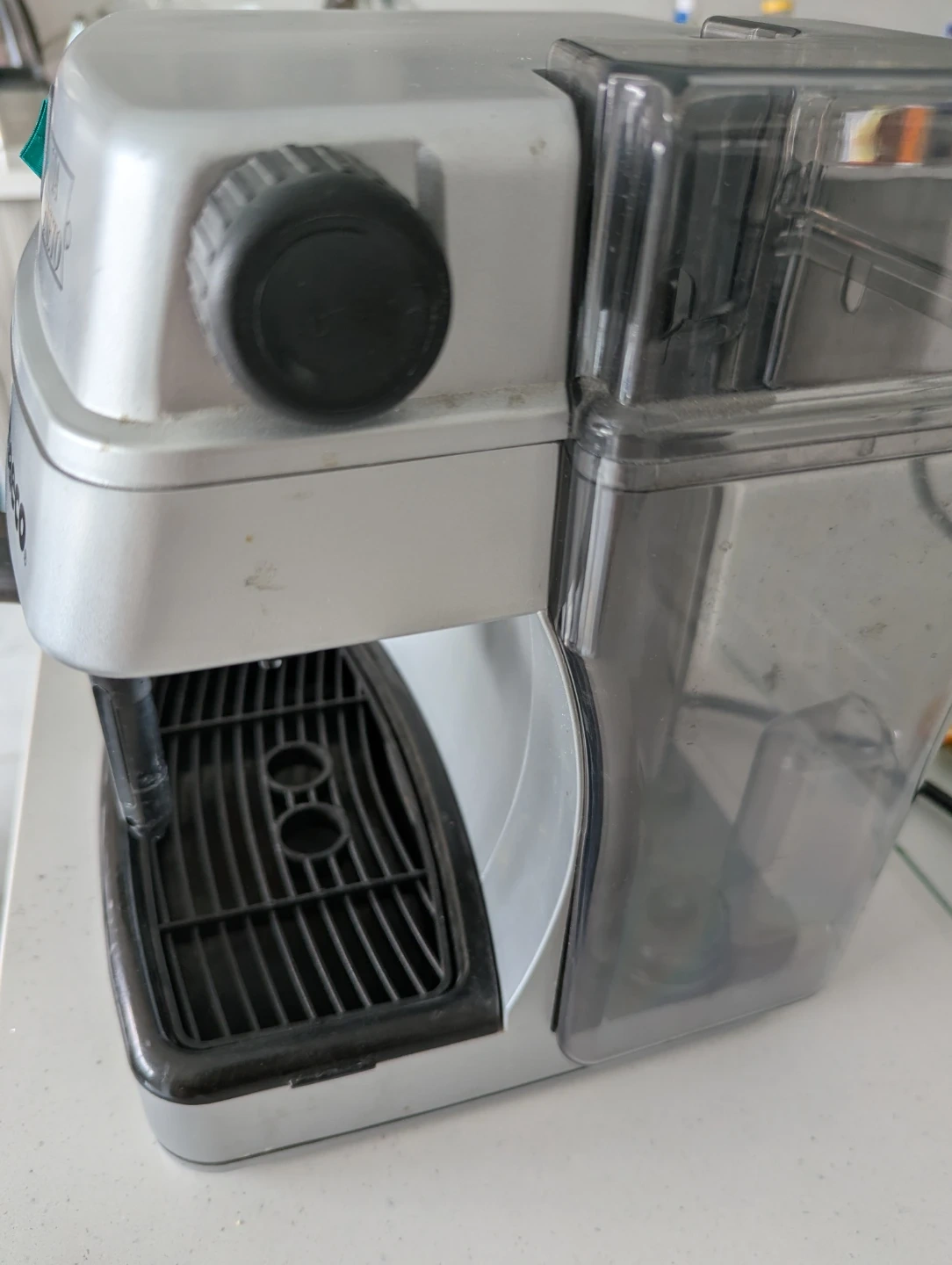 This is a Saeco Via Veneto espresso machine. It's a silver espresso maker with a removable water tank. Perfect for making your morning coffee at home!