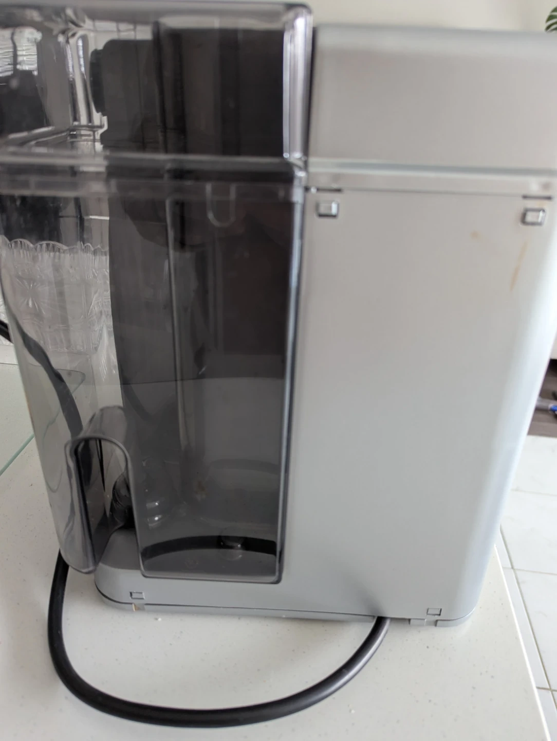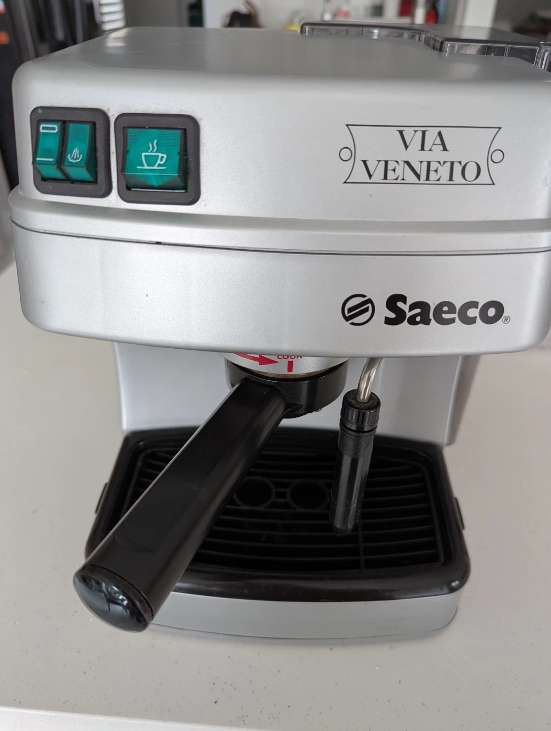 This is a Saeco Via Veneto espresso machine. It's a silver espresso maker with a removable water tank. Perfect for making your morning coffee at home!