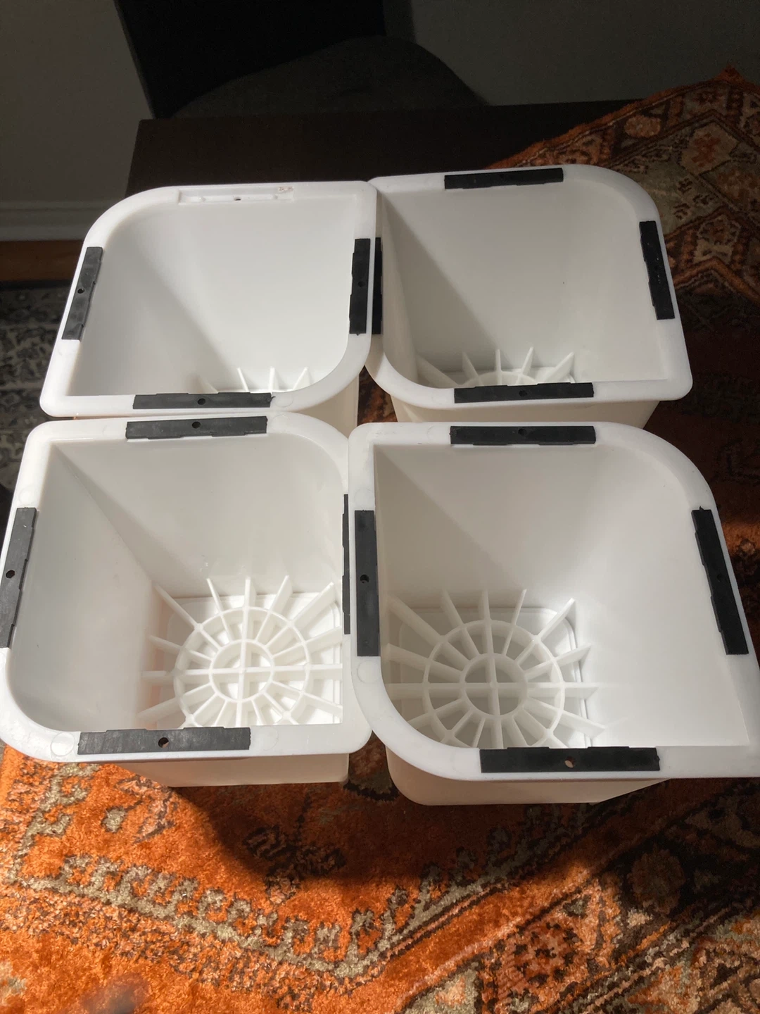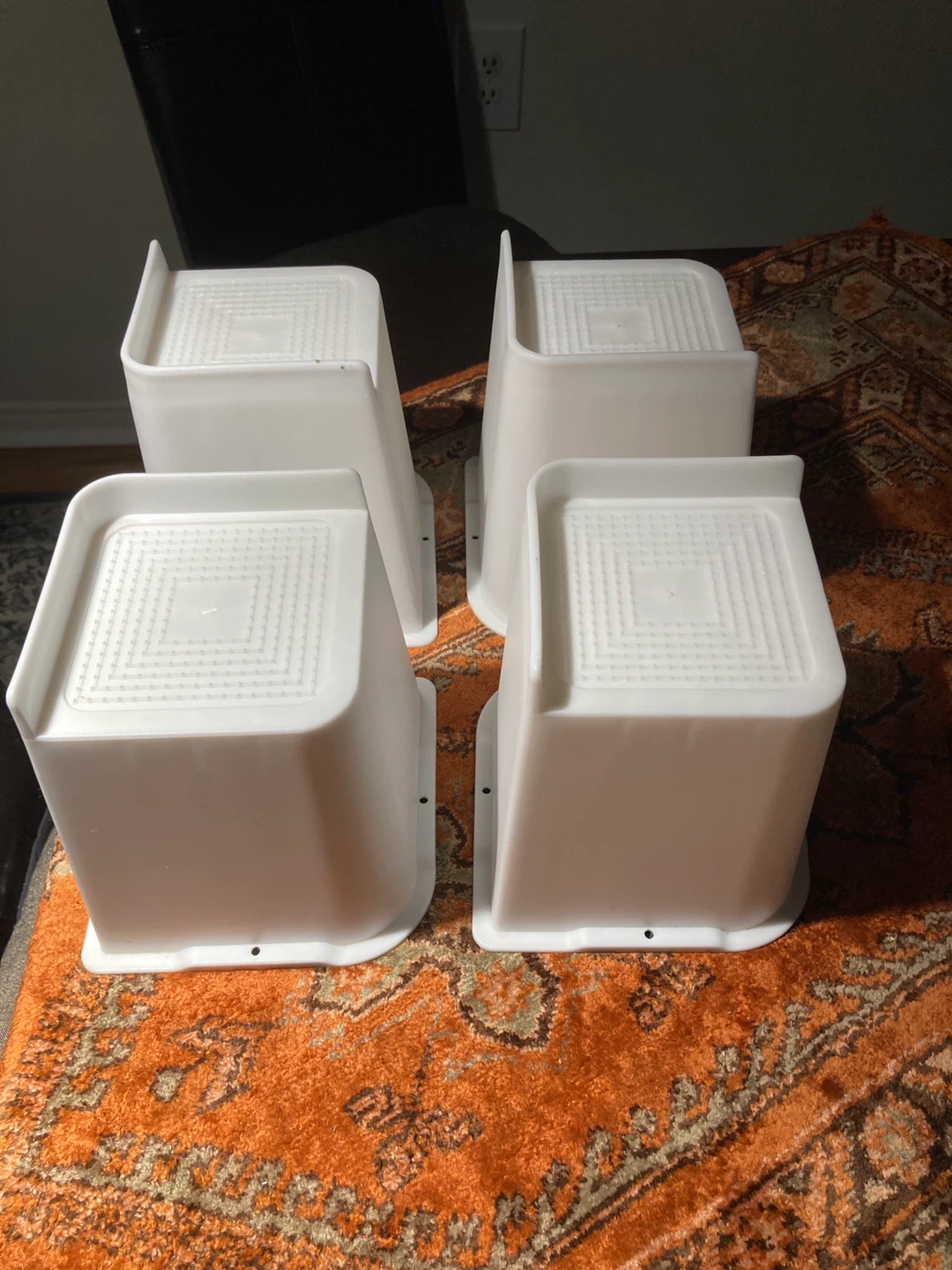 This is a set of four white plastic appliance or furniture risers. They're designed to lift appliances off the floor. The risers have a sturdy construction.