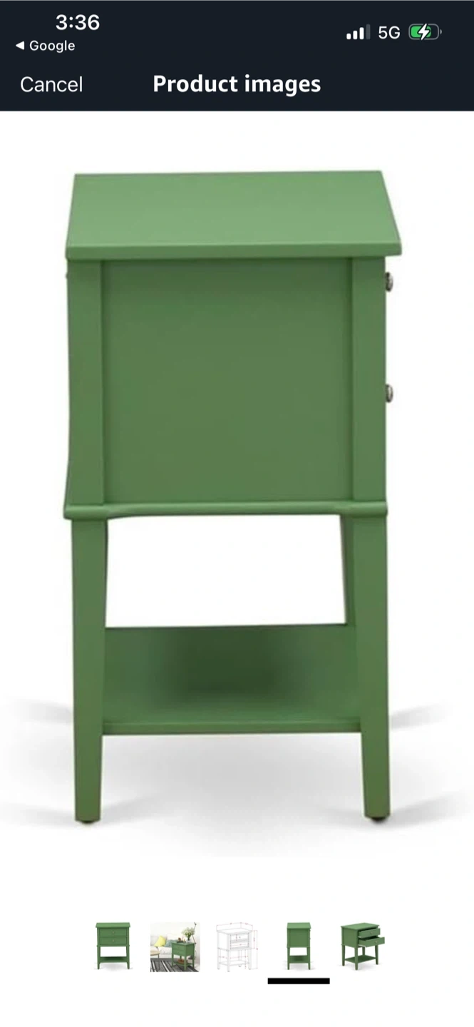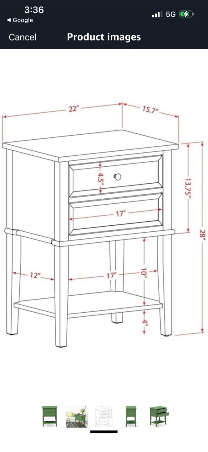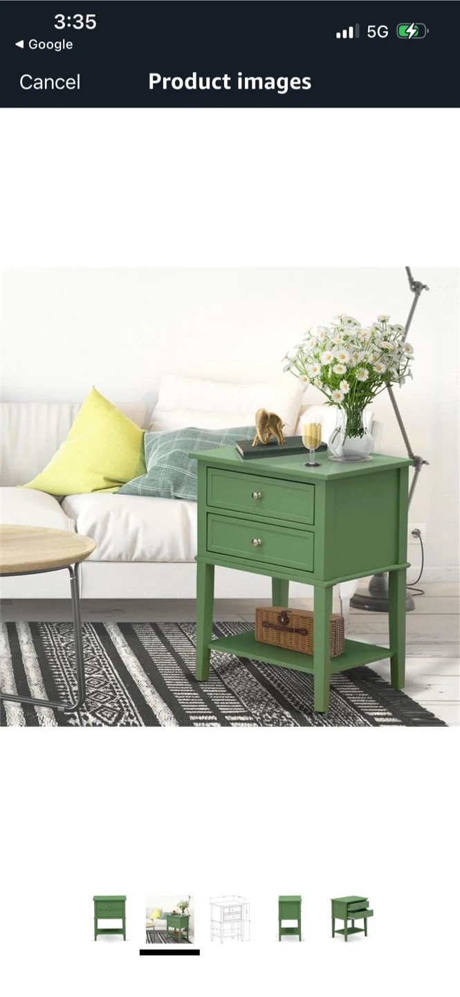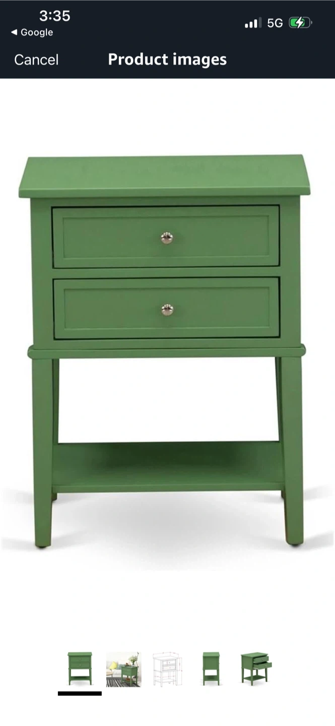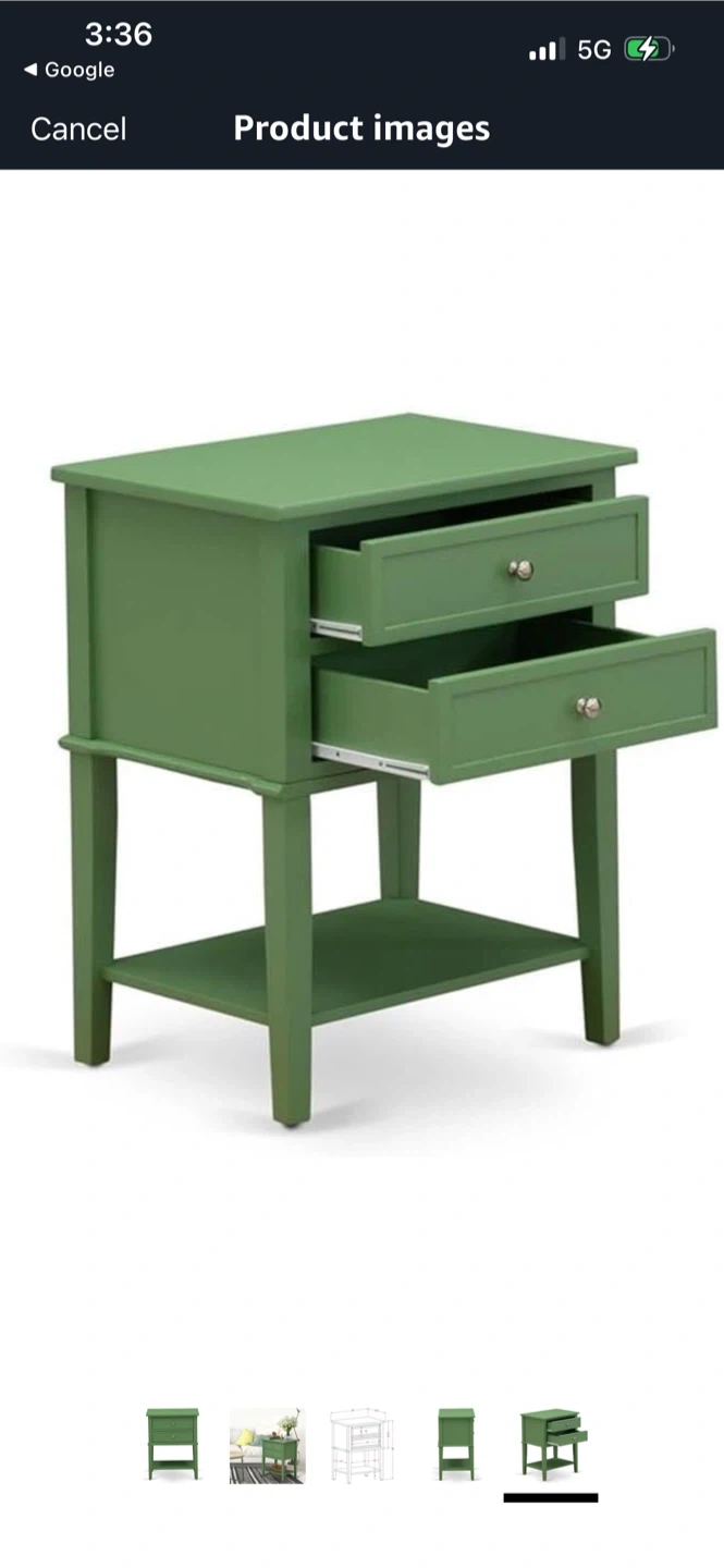 A green two-drawer end table with a shelf. Dimensions are 22" W x 15.7" D x 28" H. The drawers are 17" W and 4.5" H. This table is useful for storing items and holding lamps or decor. It would fit well beside a couch or bed.