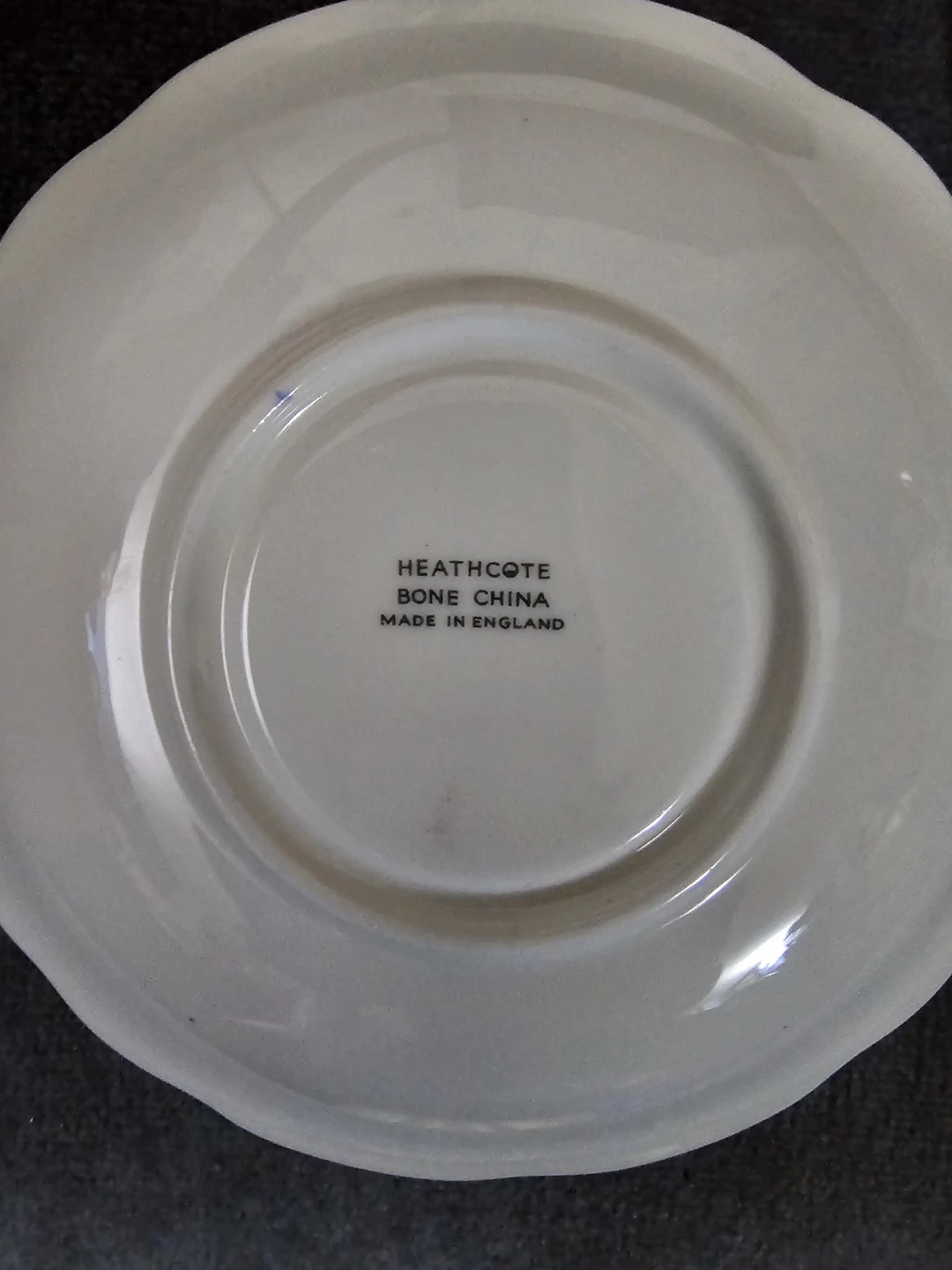 Selling a set of 5 Heathcote Bone China saucers, made in England. They have a lovely floral design with a burgundy trim. Perfect for adding a touch of elegance to your tea set! $10 each