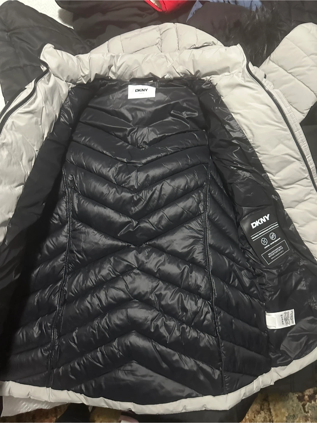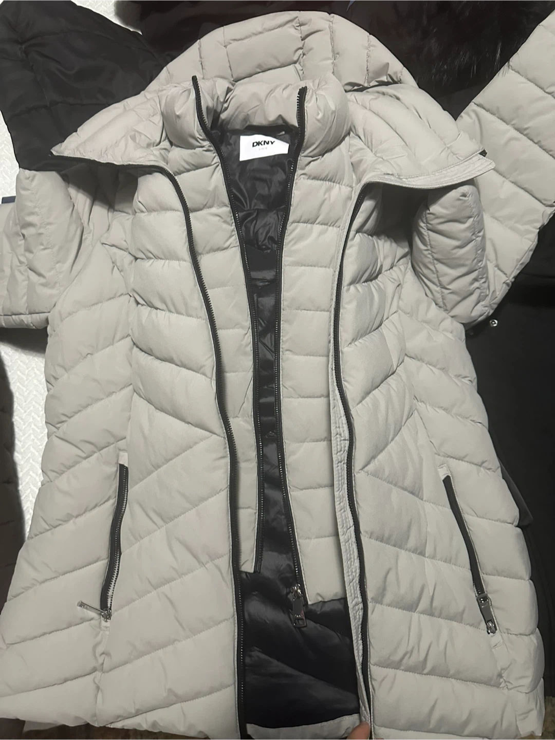 Selling a DKNY women's puffer jacket in size L. It's a stylish and warm jacket perfect for colder weather. The jacket features a hood and a quilted design. It's in great condition and ready for a new owner!