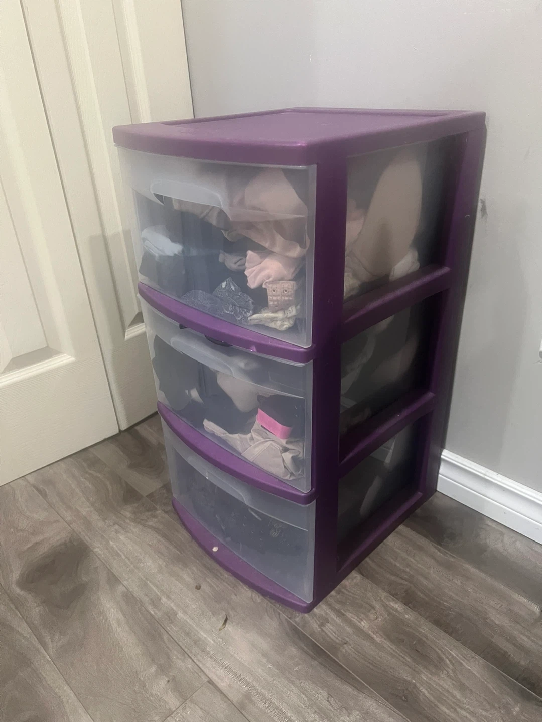 Three-drawer plastic storage unit in a purple frame with clear drawers. It's great for organizing small items like socks, undergarments, or craft supplies. The drawers are lightweight and slide easily.
