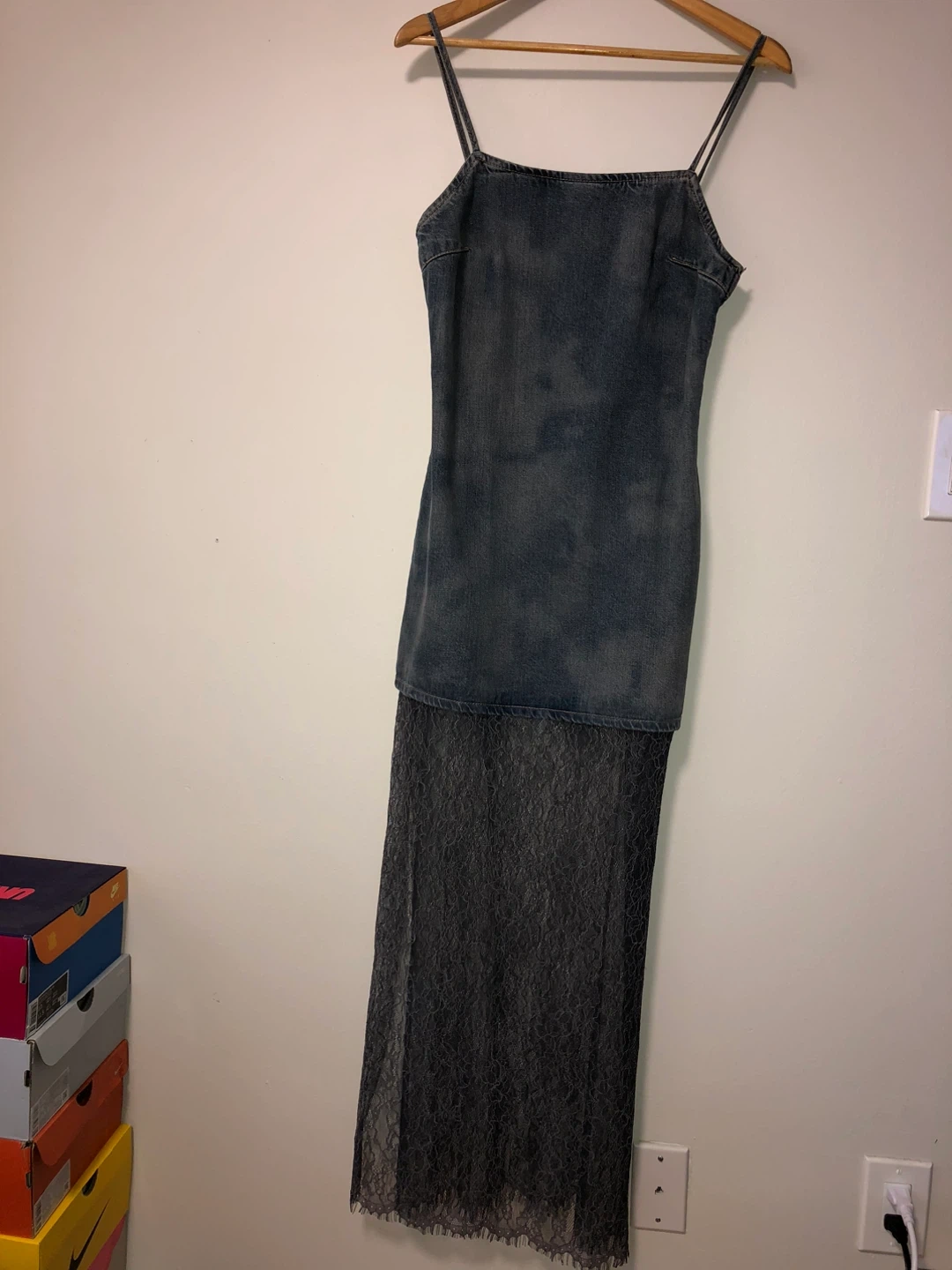 Selling a stylish dress featuring a denim top and a lace bottom. It's in great condition and ready for a new home! ( NEVER WORN, BOUGHT WITHOUT TAG)