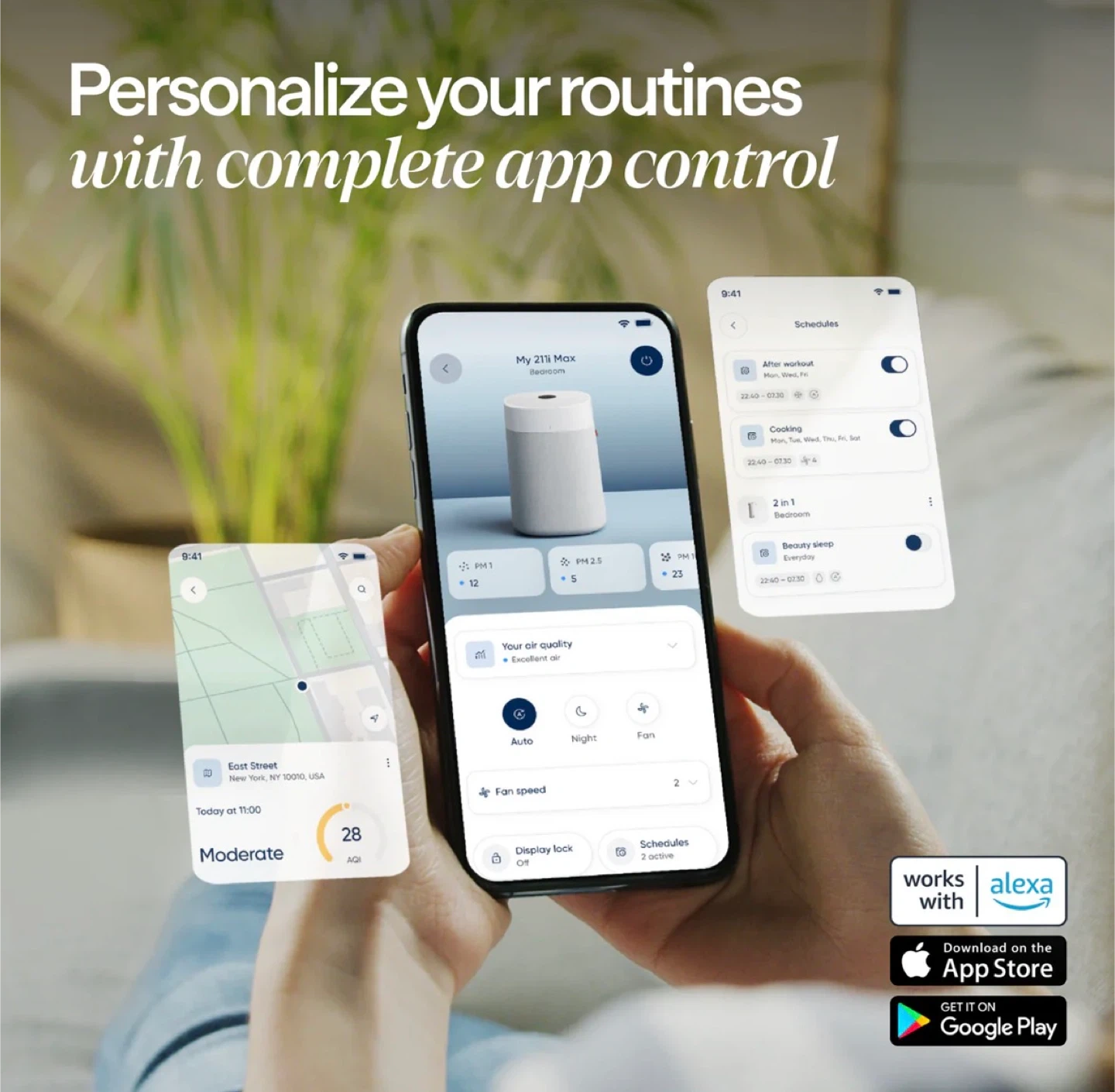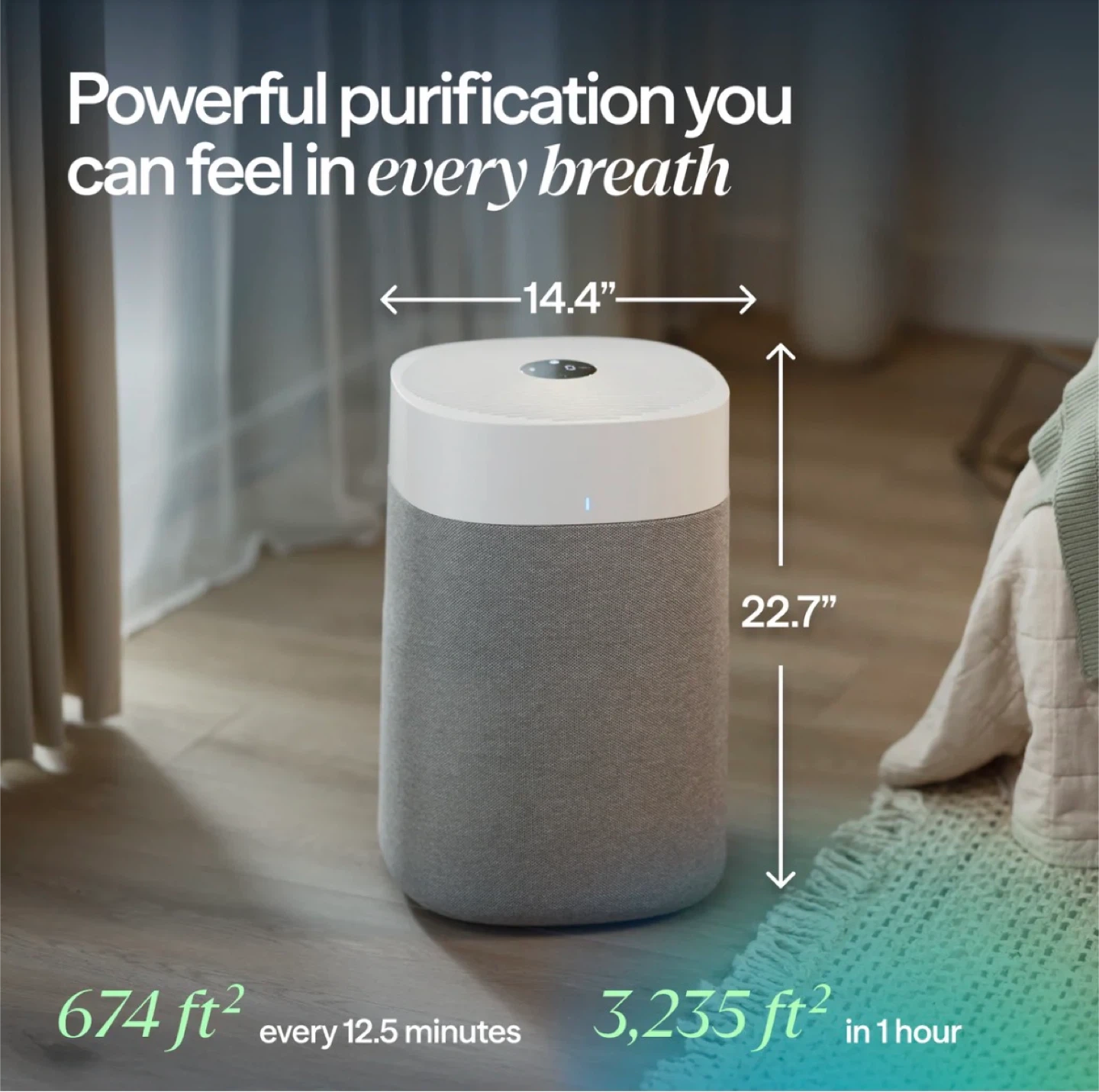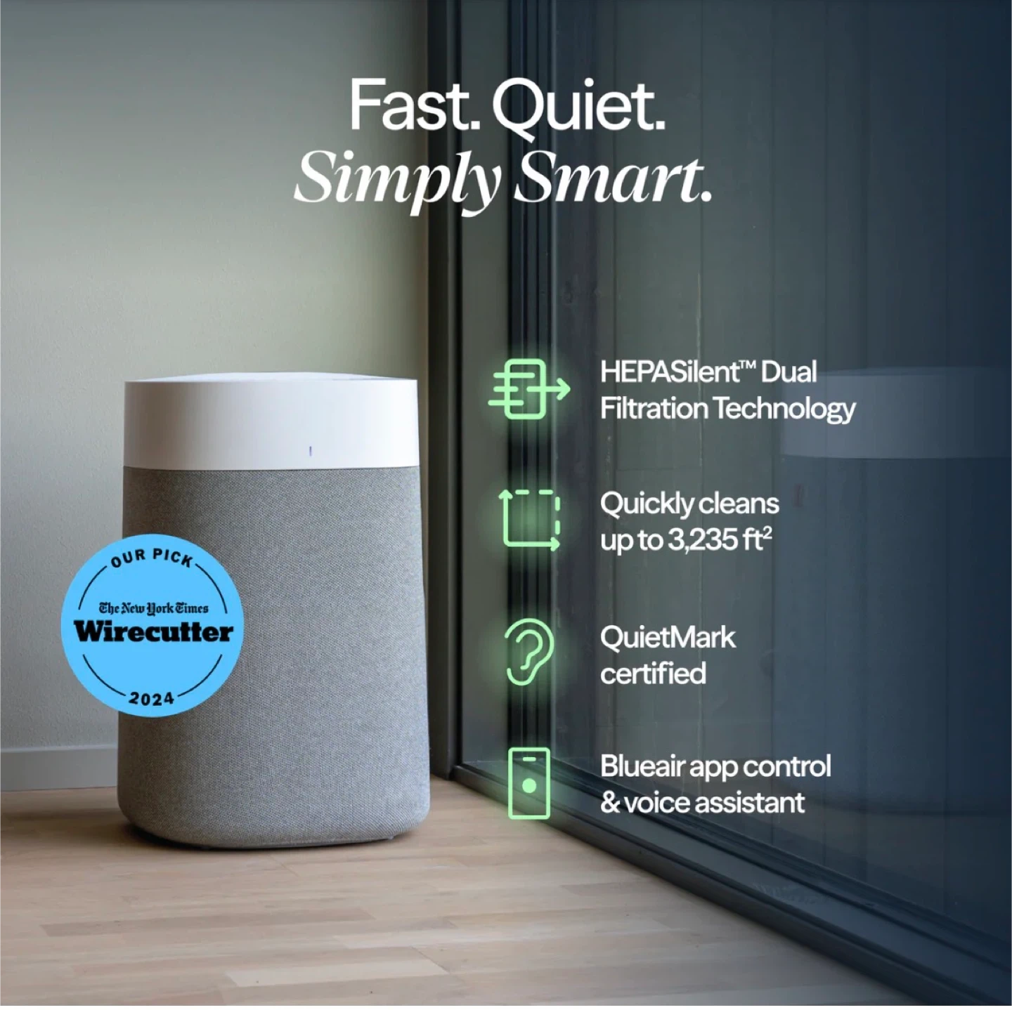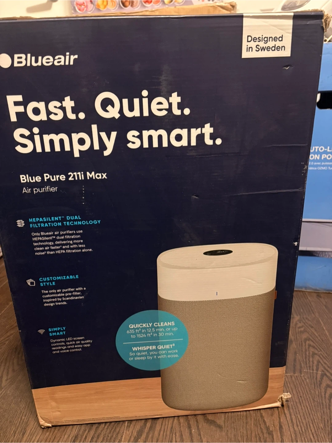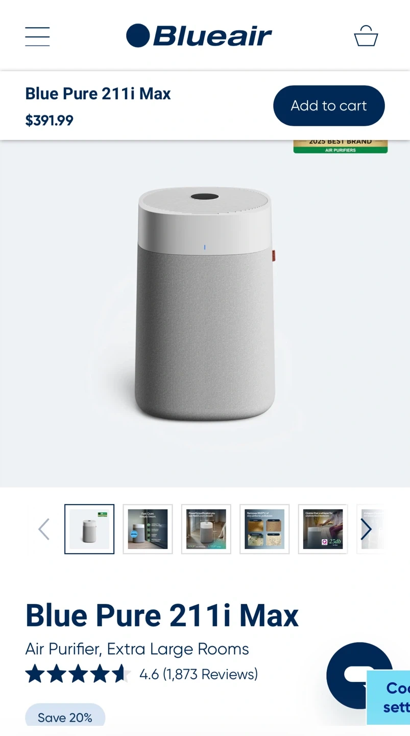 This is the Blueair Blue Pure 211i Max air purifier. It features HEPASilent dual filtration technology and is QuietMark certified. It cleans up to 3,235 sq ft in 1 hour. Control it with the Blueair app and voice assistant.