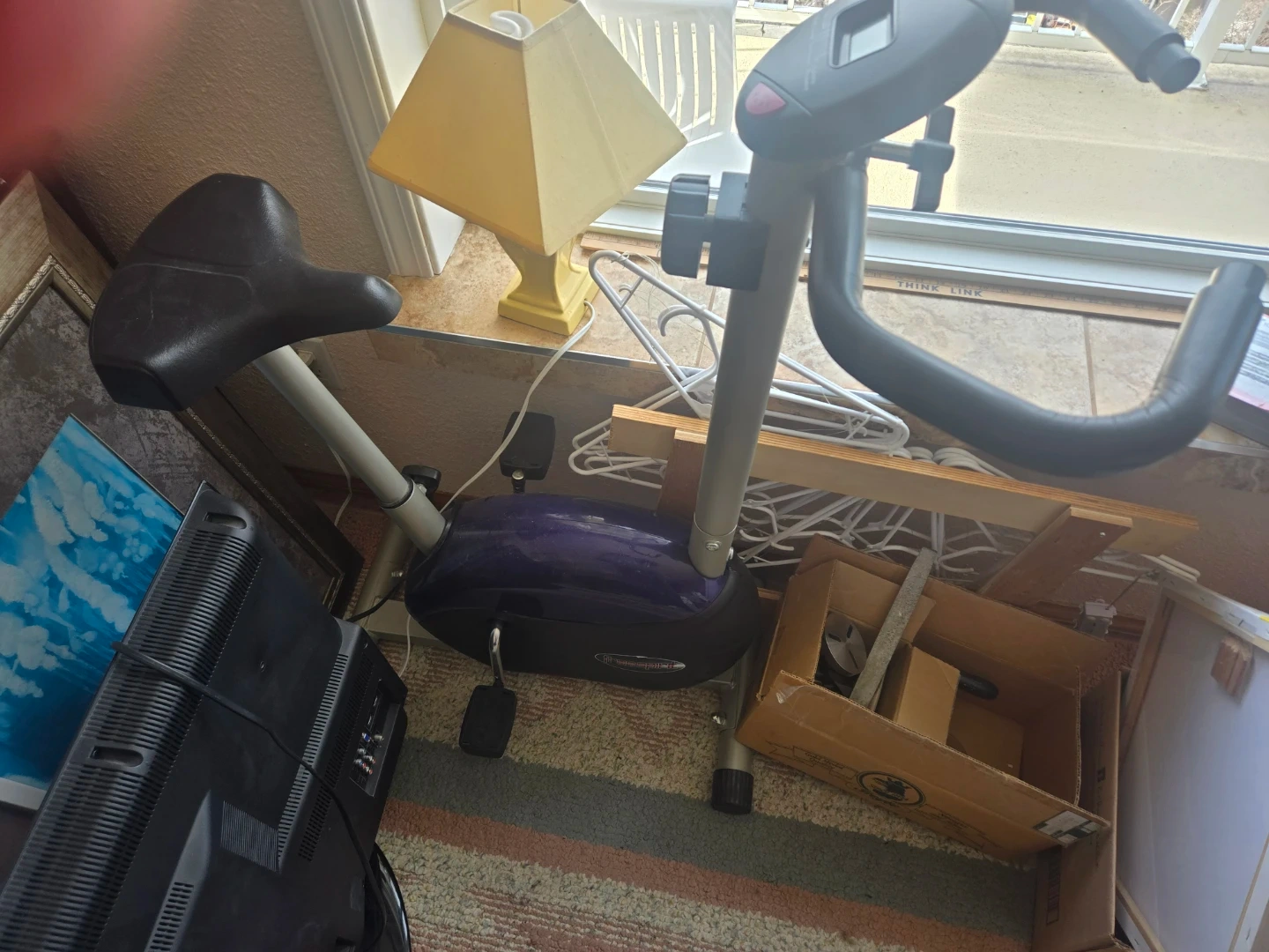 This is a Free Spirit stationary exercise bike. It's a purple and black colour. It has a digital display showing time, speed, and distance.