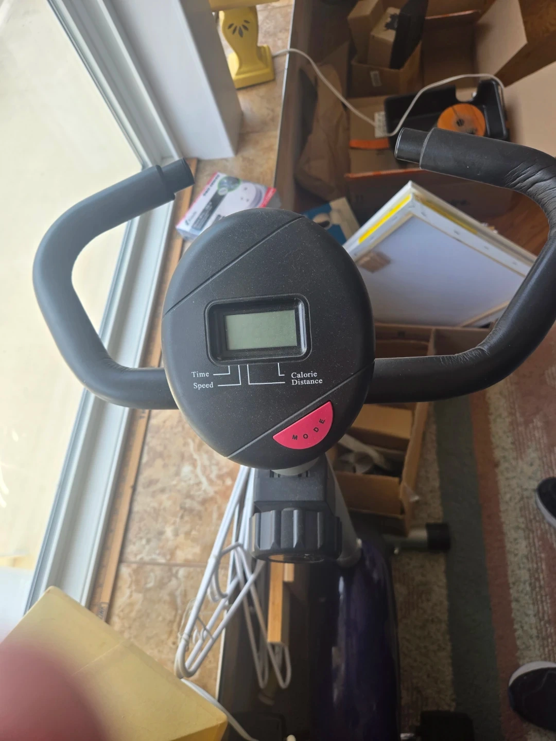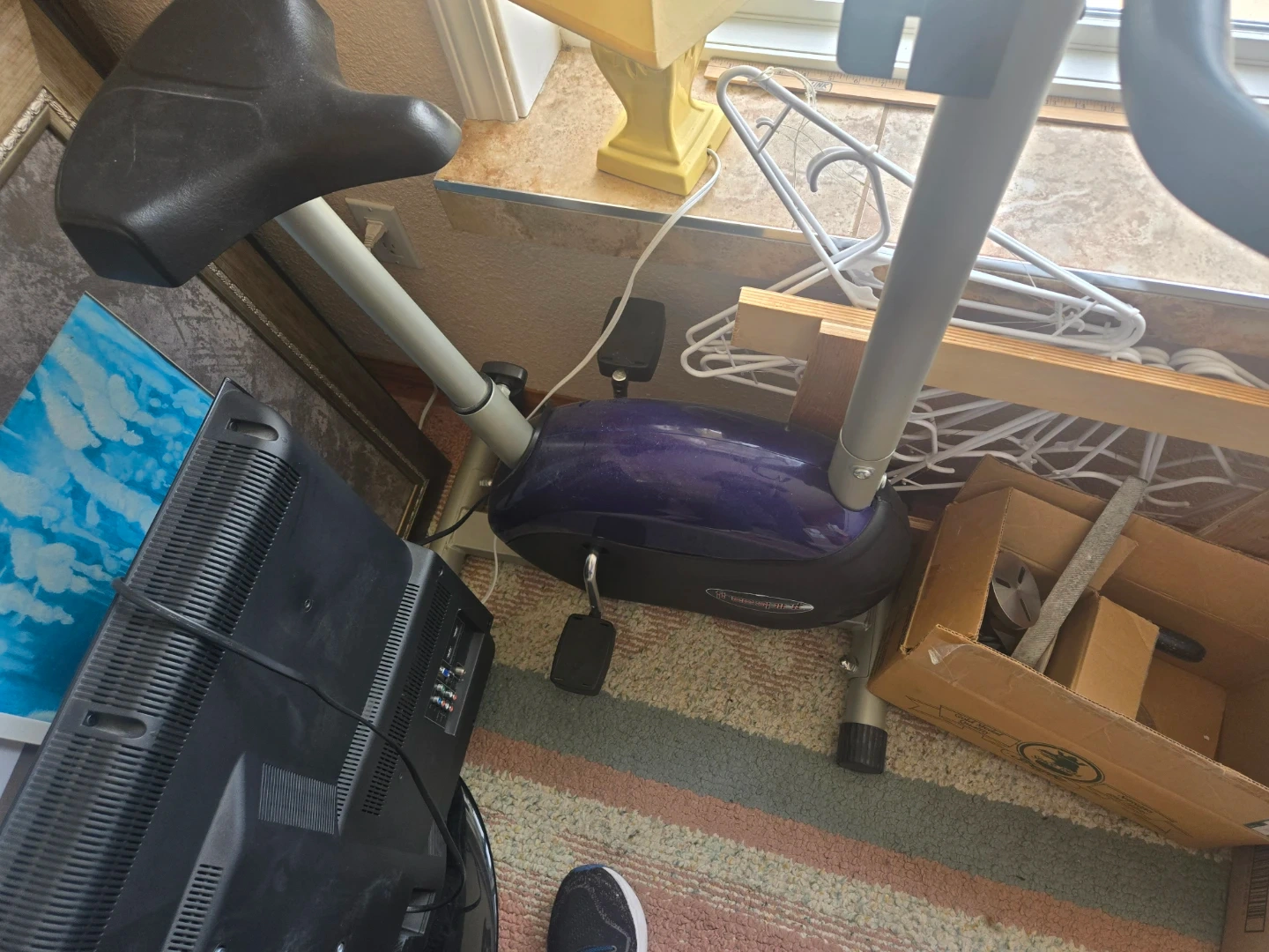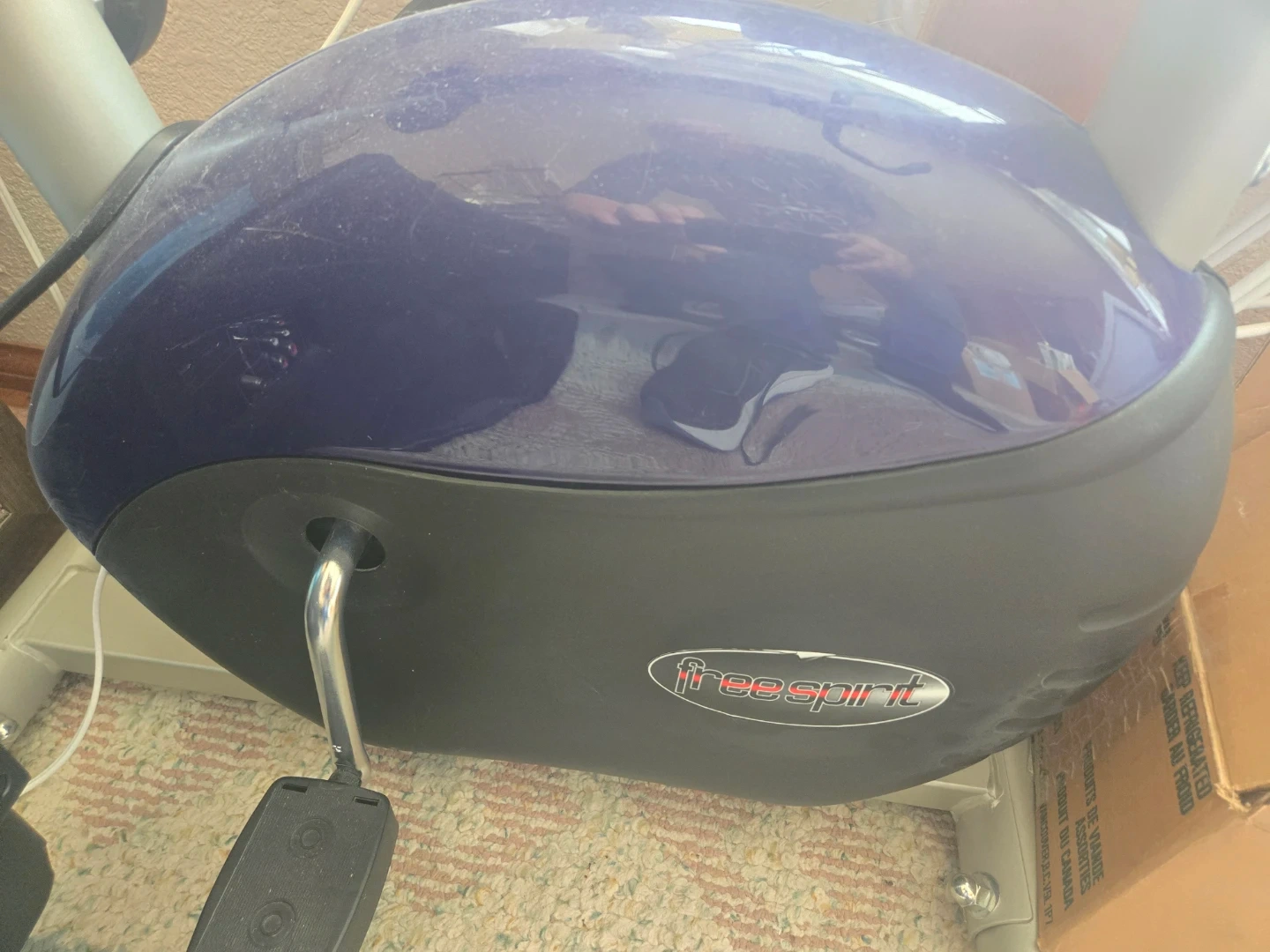 This is a Free Spirit stationary exercise bike. It's a purple and black colour. It has a digital display showing time, speed, and distance.