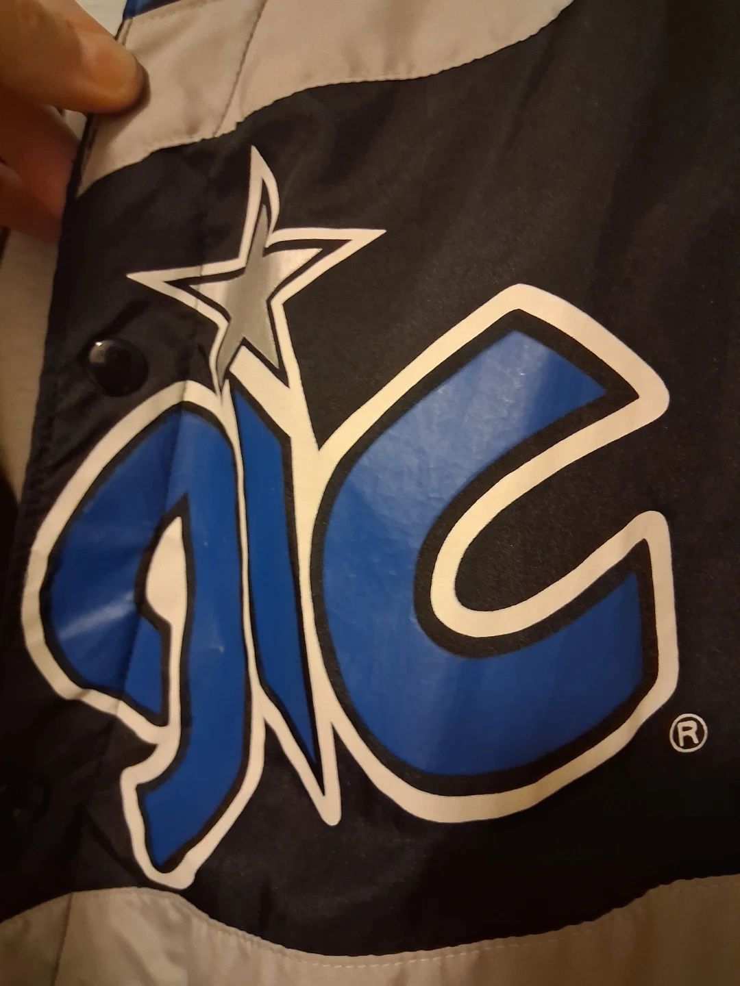 Champion Orlando Magic bomber jacket. Shell is 100% polyester, lining is 100% polyester, and the body is 65% polyester and 35% cotton. This is a great jacket for any basketball fan!
