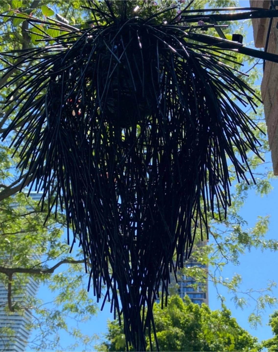 2 Black wicker planters with an interesting design. Can be hung outdoors with existing bracket. Placing your favourite plants in this planter can make any space more inviting. Plants not included .