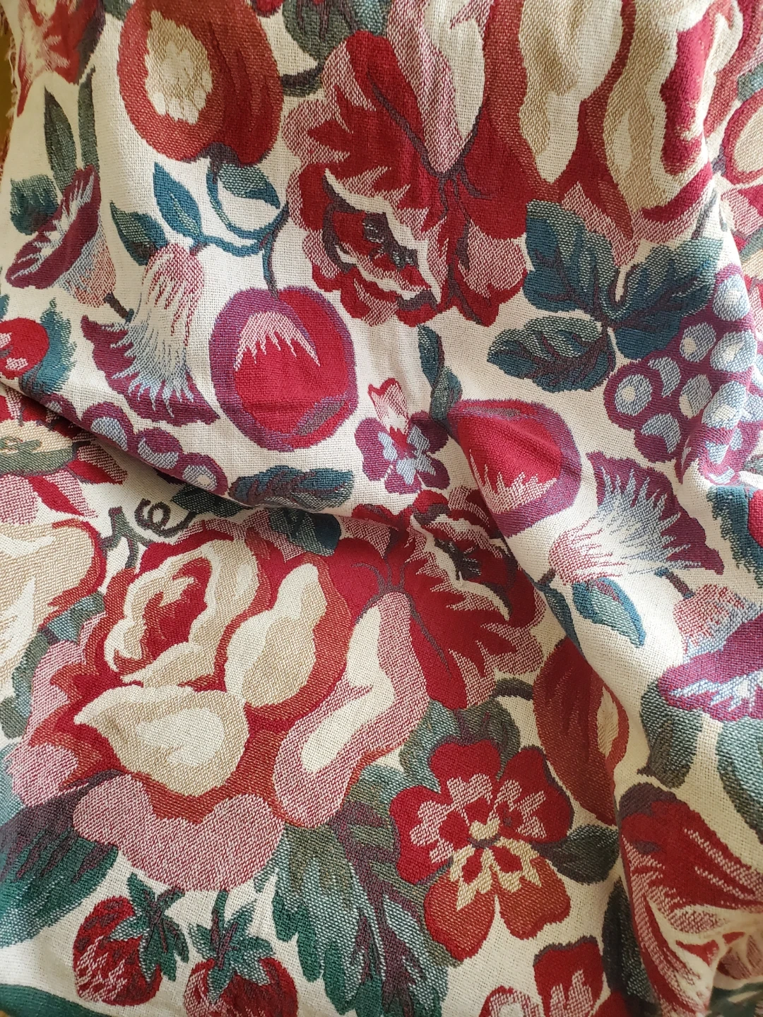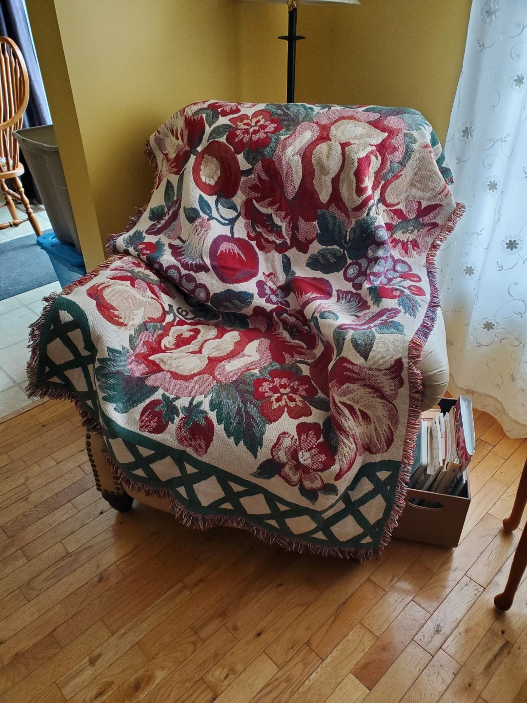 This throw blanket features a vibrant floral and fruit pattern. It's perfect for adding a cozy touch to your living room or bedroom. The fringed edges add a nice finishing detail.