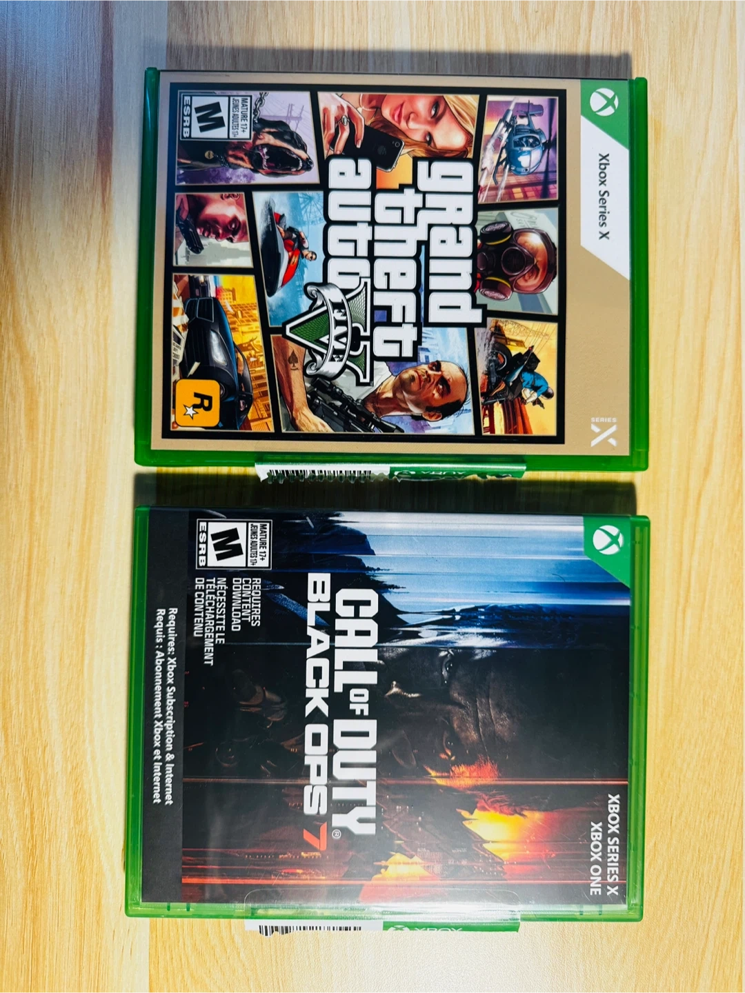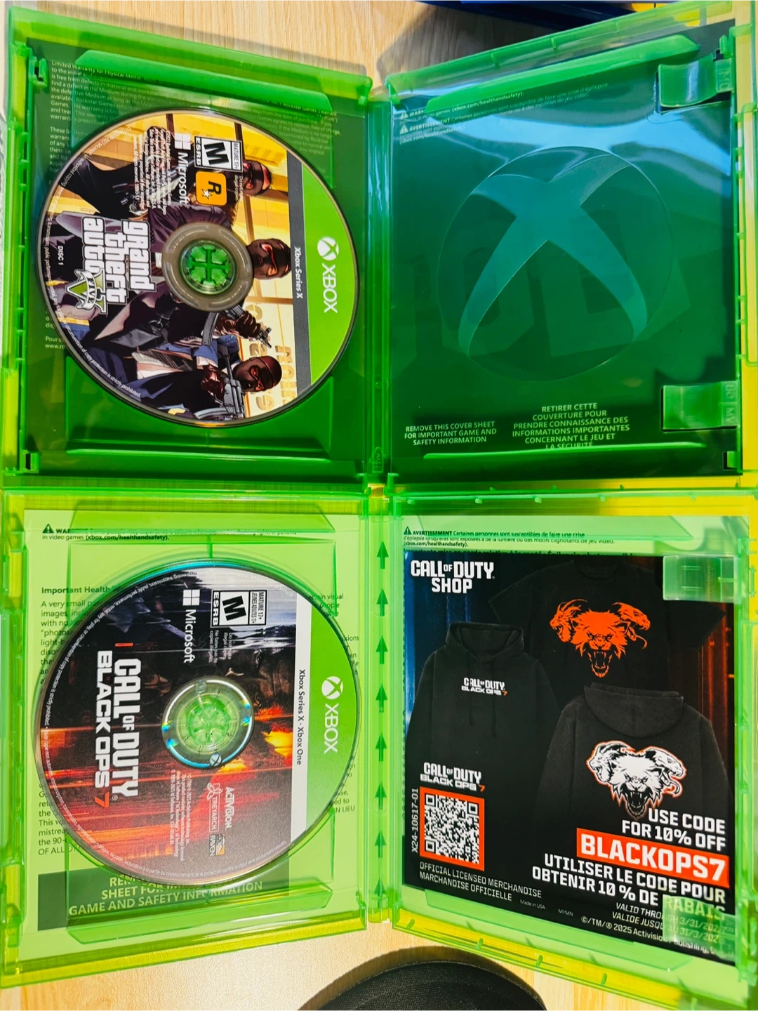Includes Grand Theft Auto V for Xbox Series X and Call of Duty Black Ops 7 for Xbox One. Both discs are in excellent condition. Great for gamers looking for action-packed titles!