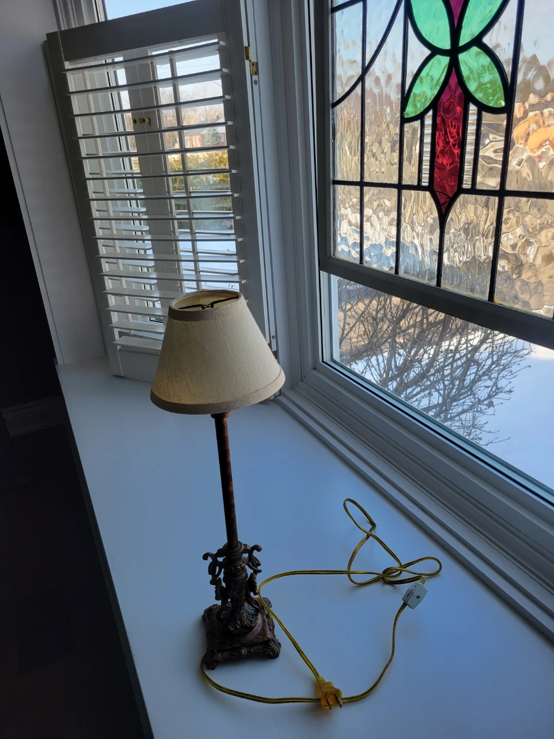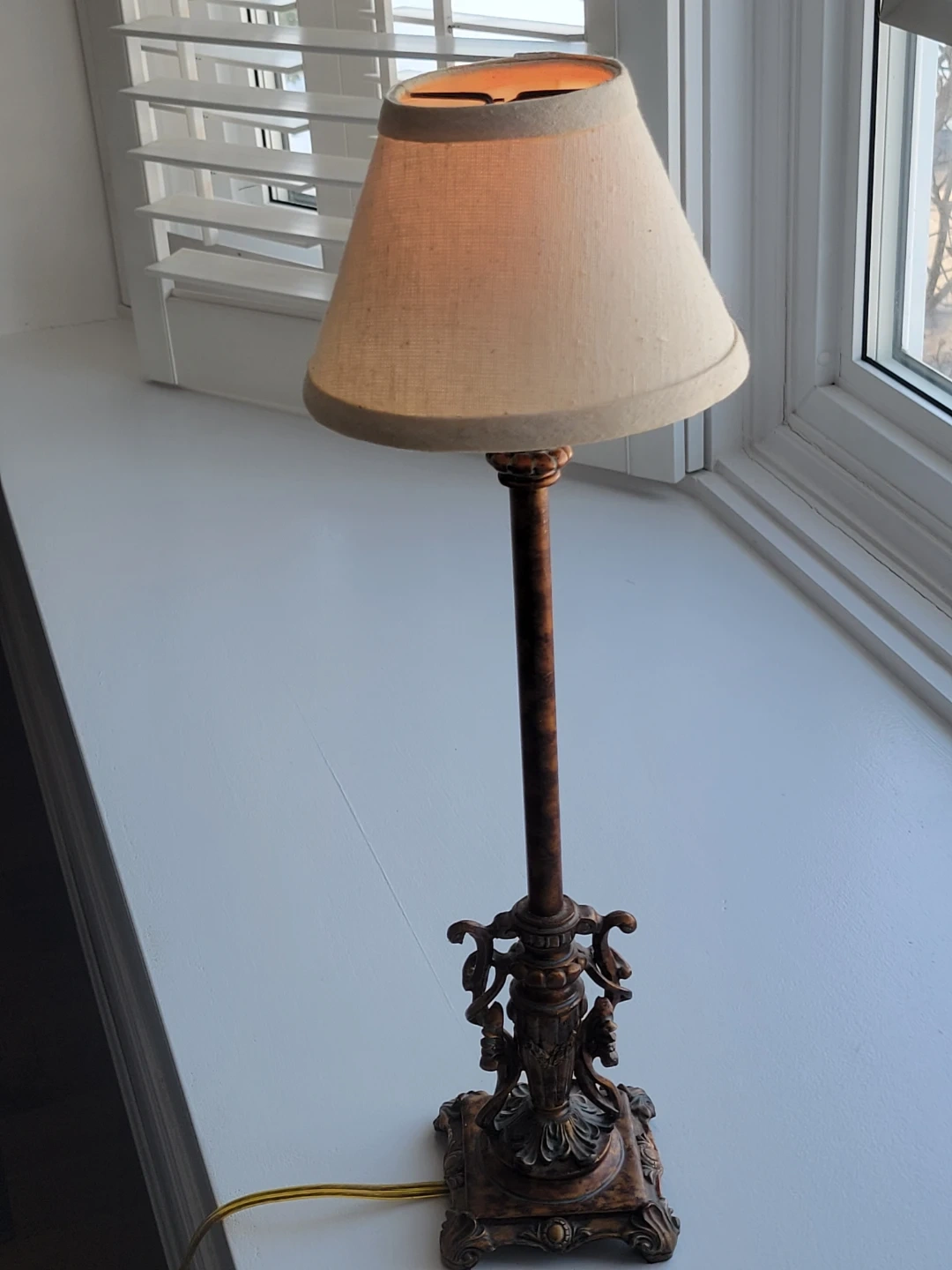 Illuminate your space with this ornate, used table lamp, featuring a candlestick design and an antique gold finish, perfect for adding a touch of vintage charm to any room. Although previously loved, this lamp still shines brightly, ready to bring a warm glow to your evenings.