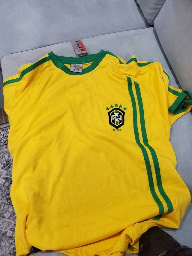 Get ready to show your support with this brand new Brazil soccer jersey! Featuring the iconic yellow and green colours, this jersey is perfect for any soccer fan. Classic Brazil design, high-quality material. Size XL available. Cash accepted.