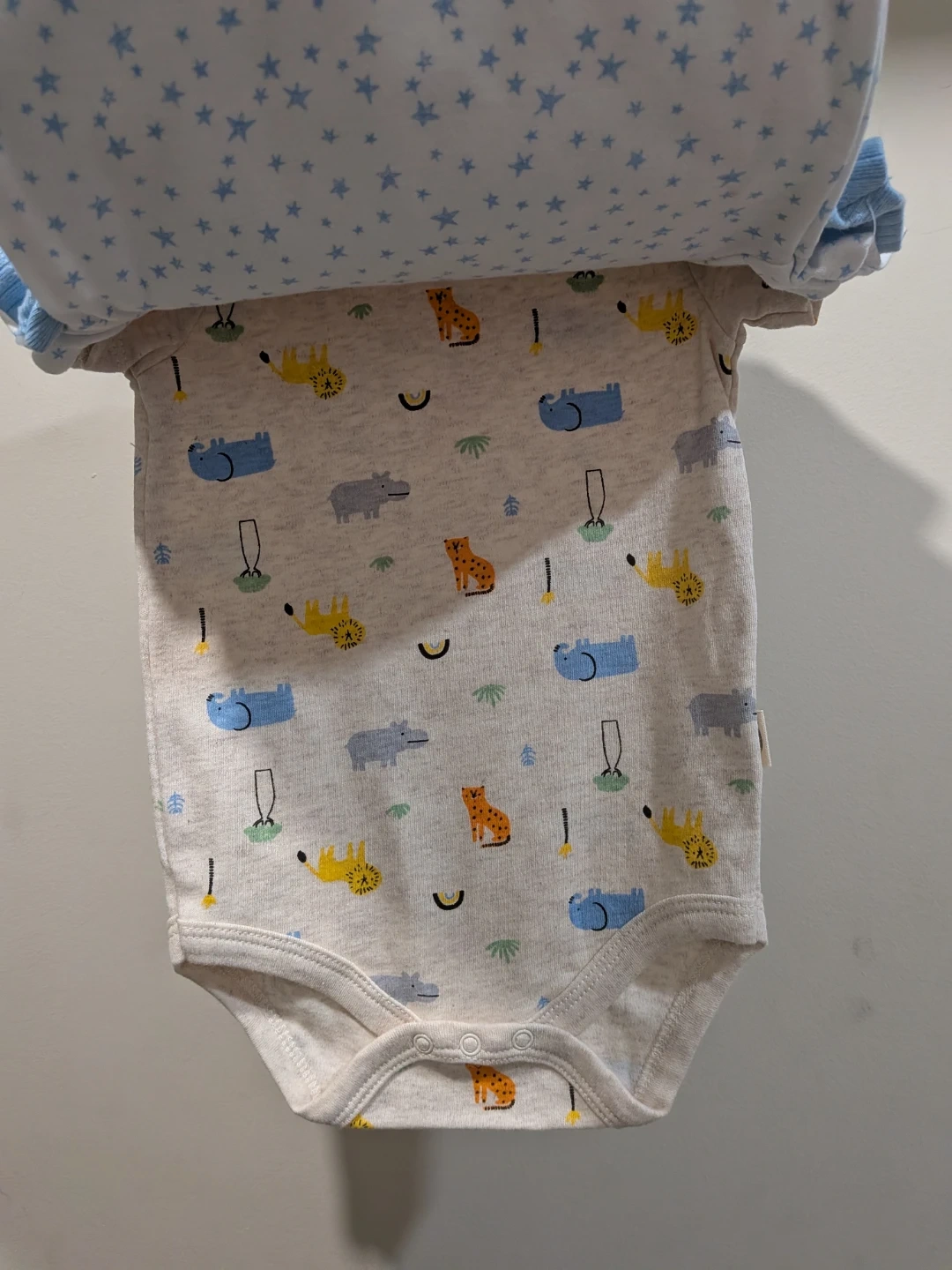 Three organic cotton bodysuits for babies. One is a soft blue ribbed style with a pocket, and the other two feature cute all-over prints: one with blue stars and another with playful animals like lions and hippos. They're snap-closure for easy changes. What a sweet set for any little one!