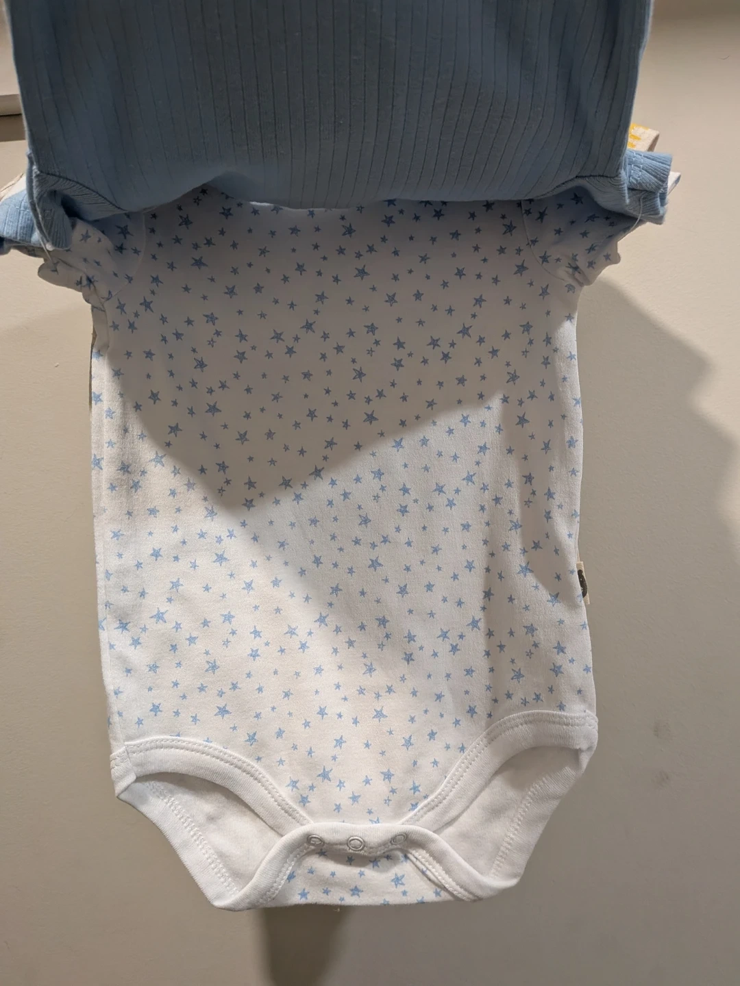 Three organic cotton bodysuits for babies. One is a soft blue ribbed style with a pocket, and the other two feature cute all-over prints: one with blue stars and another with playful animals like lions and hippos. They're snap-closure for easy changes. What a sweet set for any little one!