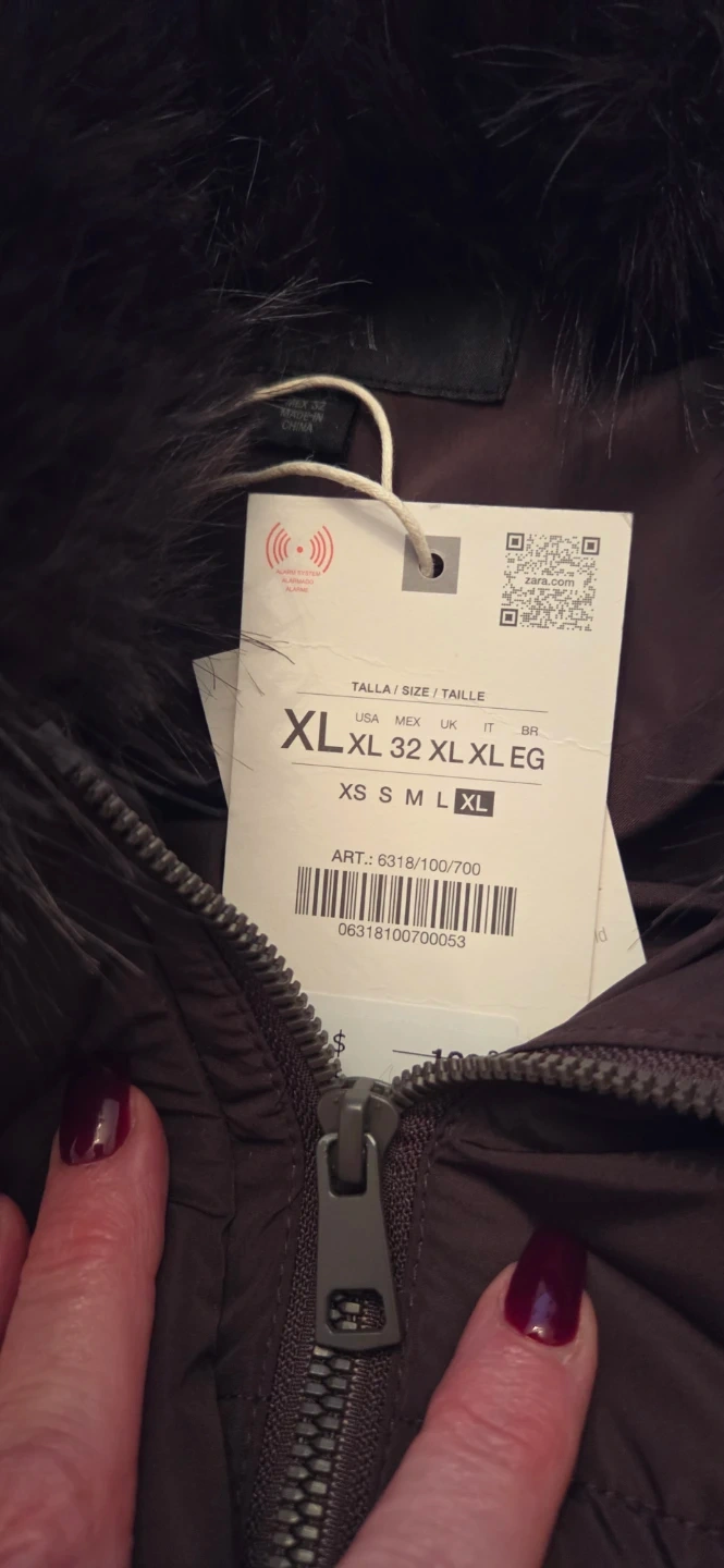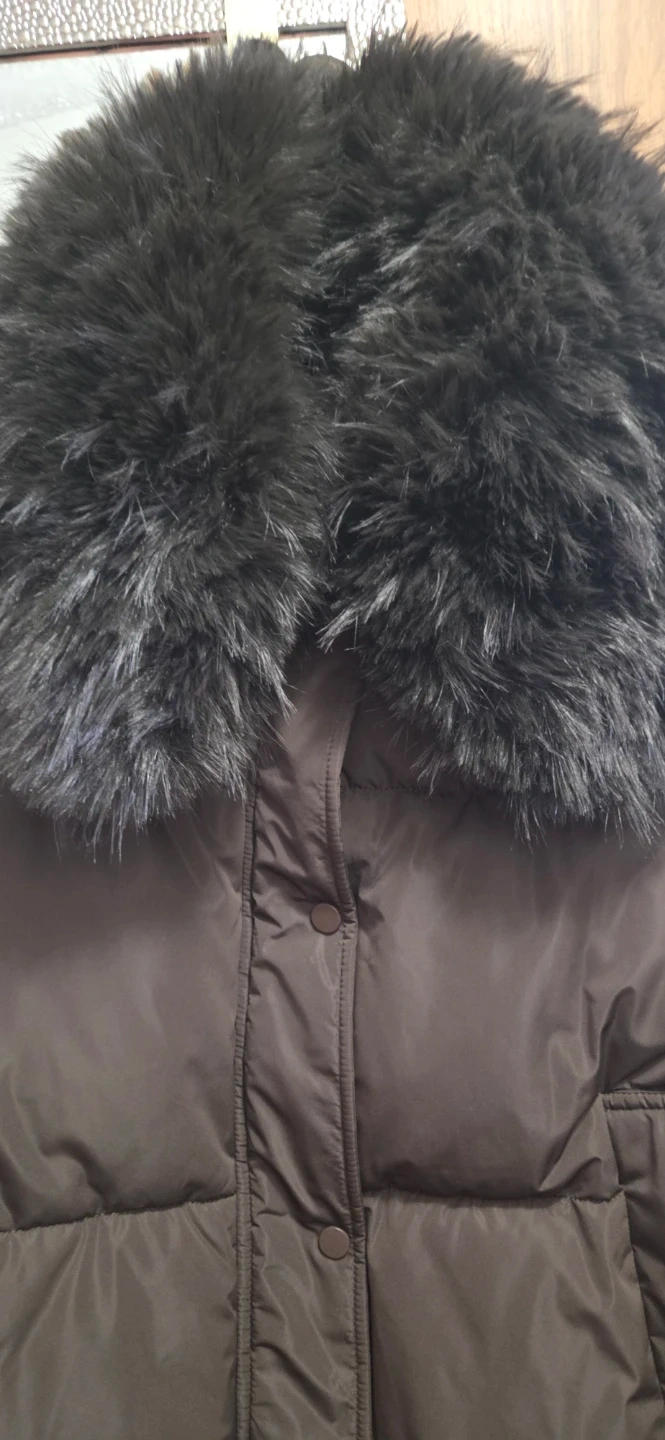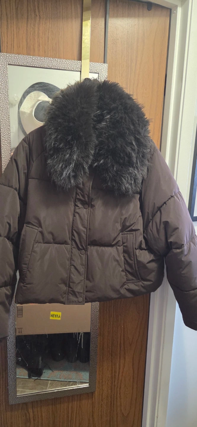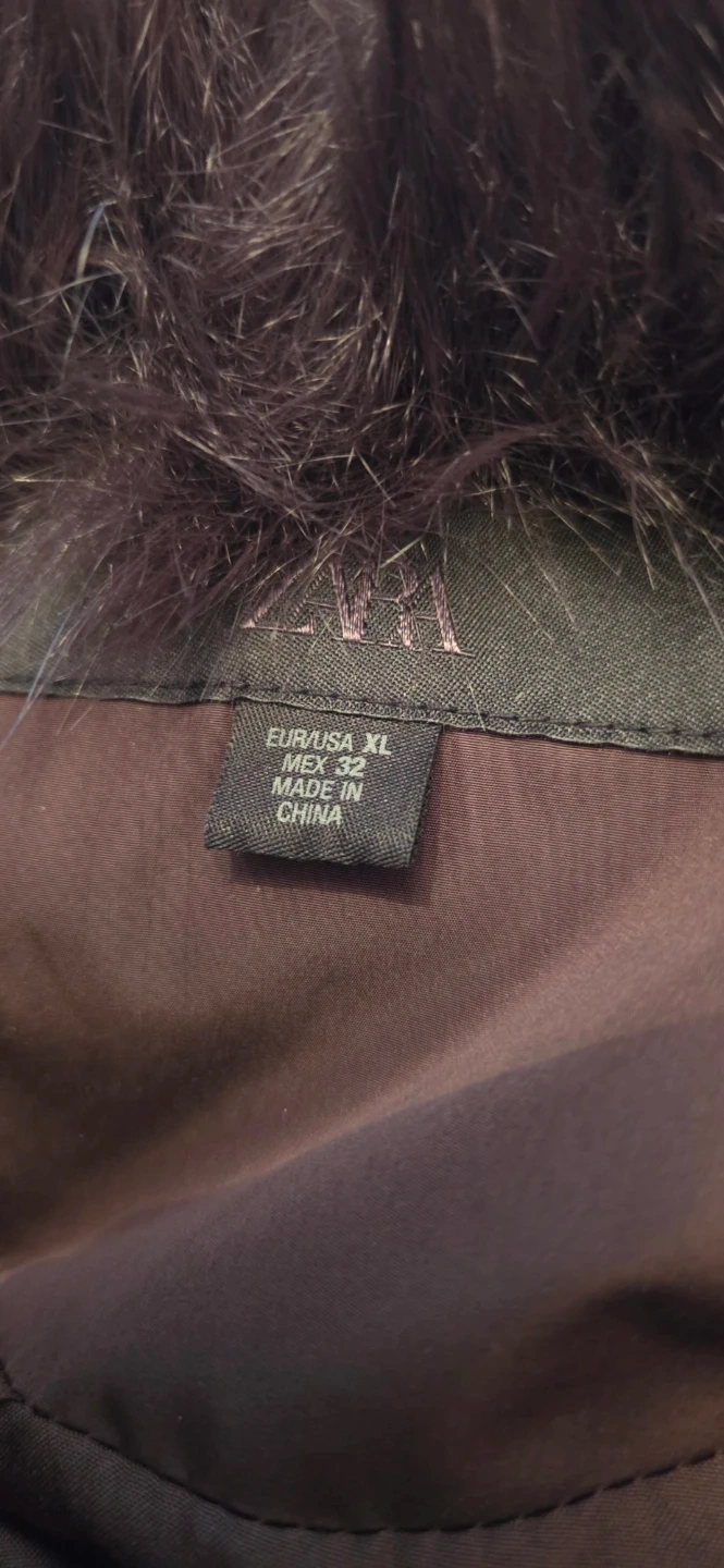 Brown puffer jacket from Zara. It's a size XL and features a large faux fur collar. The fur collar is removable. This coat is made for staying warm in cooler weather, and its very cozy!