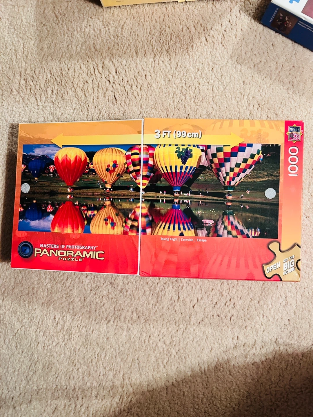 Masterpieces Panoramic puzzle featuring hot air balloons. It's 1000 pieces and measures 39" x 13" (99cm x 33cm).